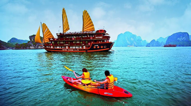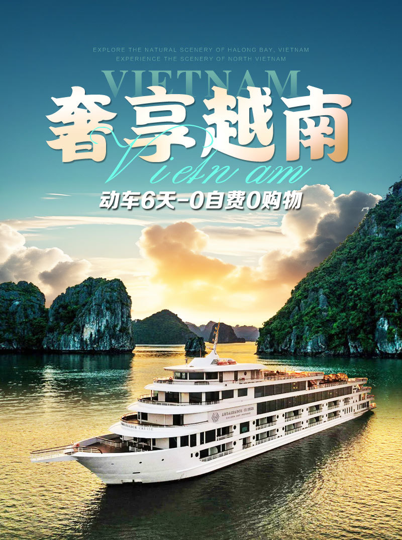 早餐后乘坐【ambassador-cruise 号或sealife-octopus号或Ha Long Princess Day Cruise 号或金刚石号或同级别】,畅游海上桂林—【下龙湾】。一边聆听抒情的音乐,边观赏下龙湾的美景,享用约 100 种高级菜肴,(含自助午餐+自助下午茶)。倘佯于万顷碧波之中;漫游被国际教科文组织评为世界自然遗产之一的“海上桂林”—下龙湾,在 1500多平方公里的海面上、耸立着 3600 多座大小不一、千姿百态的喀斯特地貌的山石、更以其“海美、山幽、洞奇”三绝而享誉天下。前往【惊讶洞】,惊讶洞的特色是它很象天上宫殿的辉煌美丽。这里有经数百万年造化形成的,多彩多样的巨型石乳,特别还有龙王形象及其极富人文性传说的文化蕴味。洞内的中心有四个大柱子支撑着,从柱脚到柱顶有许多奇形怪状的钟乳石,有的如鱼有的似鸟,有的像人类生活画面等等,中间和四周都有着多彩多样的,巨大雄伟,精致柔美的石块石乳,在灯光的照耀下,那些石乳忽然发亮反射着金刚石似的五彩光影。换乘【快艇】前往越南最浪漫、最漂亮的岛屿【天堂岛】,天堂岛是下龙湾唯一有沙滩的岛屿,金黄色的沙滩,蔚蓝色的海水,仿佛置身世外桃源一般,登上天堂岛,领略“会当凌绝顶,一览众山小”的感觉,环顾四周,如同进入蓬莱仙境。随后返回码头。前往【下龙湾海滩】绵延近千米的下龙沙滩,椰树成林, 碧浪白沙,海水明澈,碧蓝天空一望无际,与海水相融相接,长长的海滩宛若一条白色绸带蜿蜒在海岸边。沙滩的惬意安然,赤足漫步在海边上能感受到与浪花热情的玩耍邀请。后乘坐【观光车环游下龙湾】,深入了解下龙当地生活。