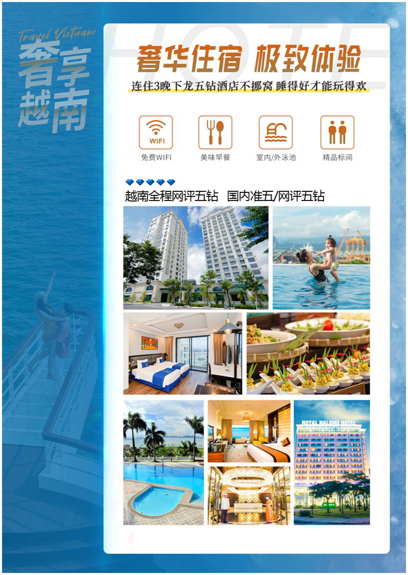 2、【住宿】全程入住携程五钻酒店标准双人间,若出现单男或单女且团中无同行团友同住 ,需要补单人房差。(越南条件相对国内较差,敬请理解)。