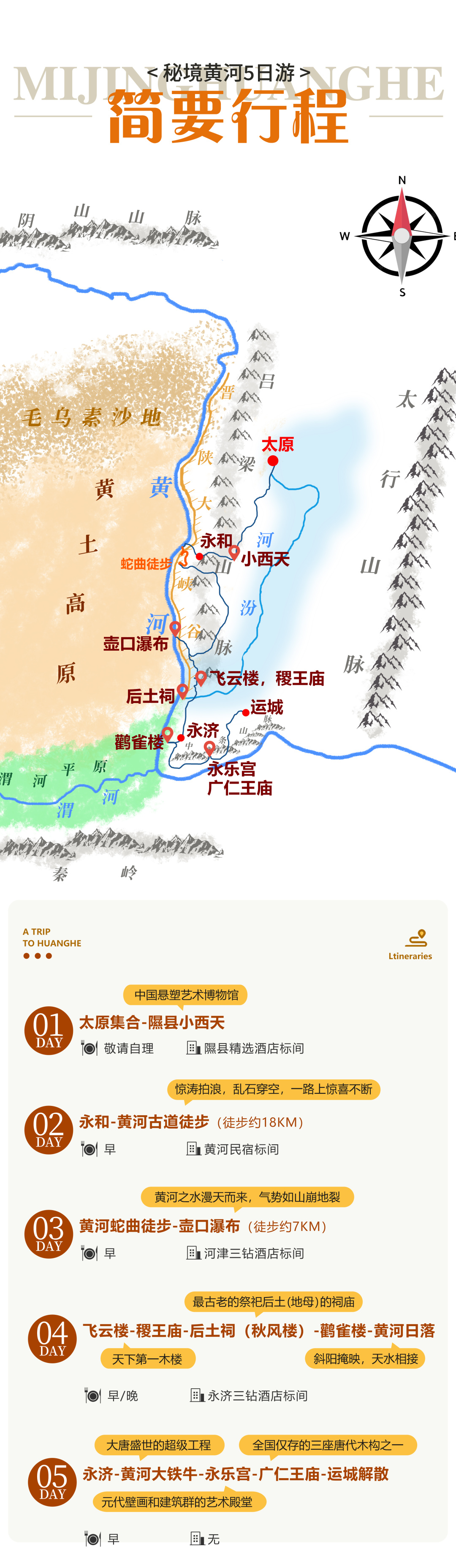 4、全程门票费用(小西天门票,壶口瀑布门票,东岳庙门票,稷王庙门票,后土祠门票,鹳雀楼门票,永乐宫门票,广仁王庙门票),凭有效证件产生门票减免的,将退还相关费用哦;