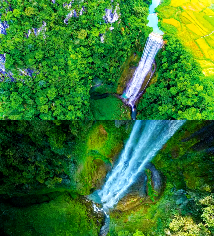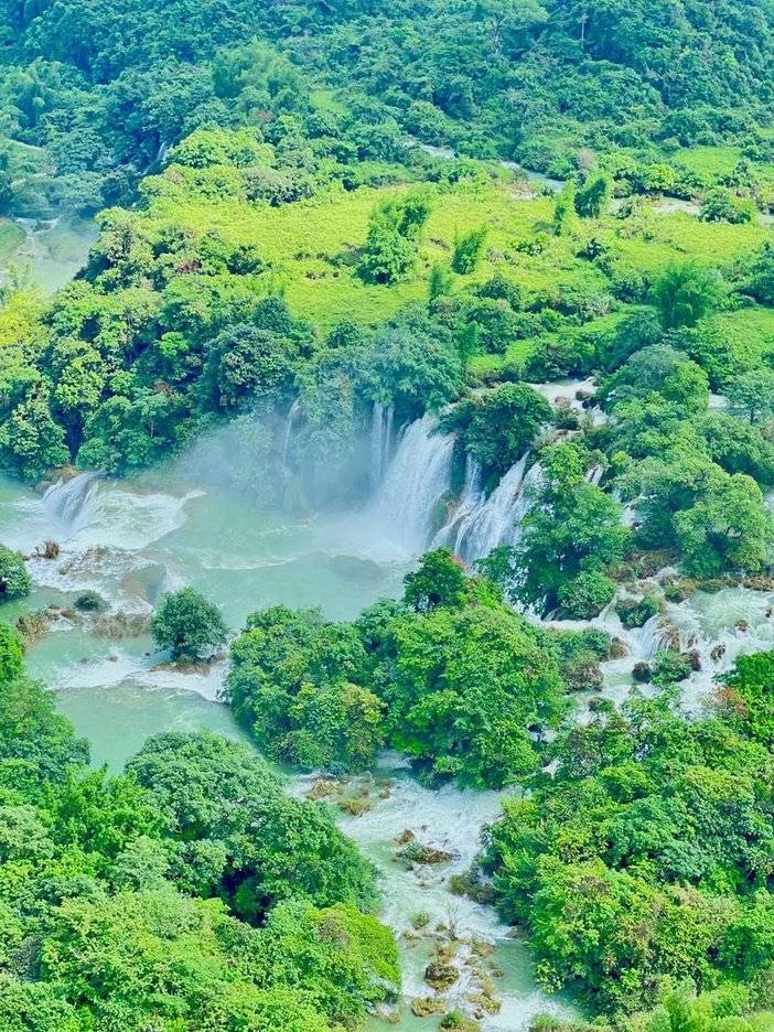 它横跨中越两国,与[越南板约瀑布]相连,宽200多米,落差70多米,纵深60多米, 年平均水流量是黄果树瀑布的三倍,瀑布气势磅礴,三级跌落,声势浩大,无论远观近看,其魄力、其气势、其风采,都让人震魂摄魄