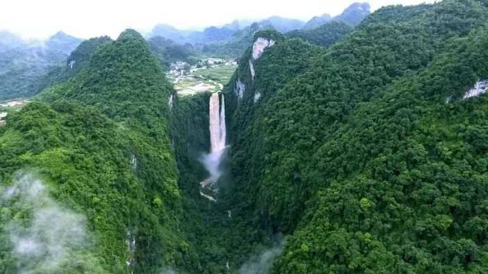 汹涌清澈的河水一头扎进"天坑",形成一个单程高达160多米的瀑布倒挂前川。雨季来临,峡谷内瀑布声如滚滚春雷;震耳发聩;旱季时节,峡谷内瀑布声如喧哗闹市,令人神往。更令人称奇的是,从天而降的大瀑布与从地下突然冒出的长约800米的地下河交汇,一起进入瀑布下方一个叫鸳鸯潭的深潭后,便又悄没声儿地消失在地下河中,不管多大的水都无法淹没峡谷。步入峡谷,但见古树老藤遮天蔽日,珍稀植物种类繁多,山涧清流急喘直下,溶洞景观天然独特。而隆隆的大瀑布则给大峡谷更增添了神秘莫测的色彩和无比壮丽的景观