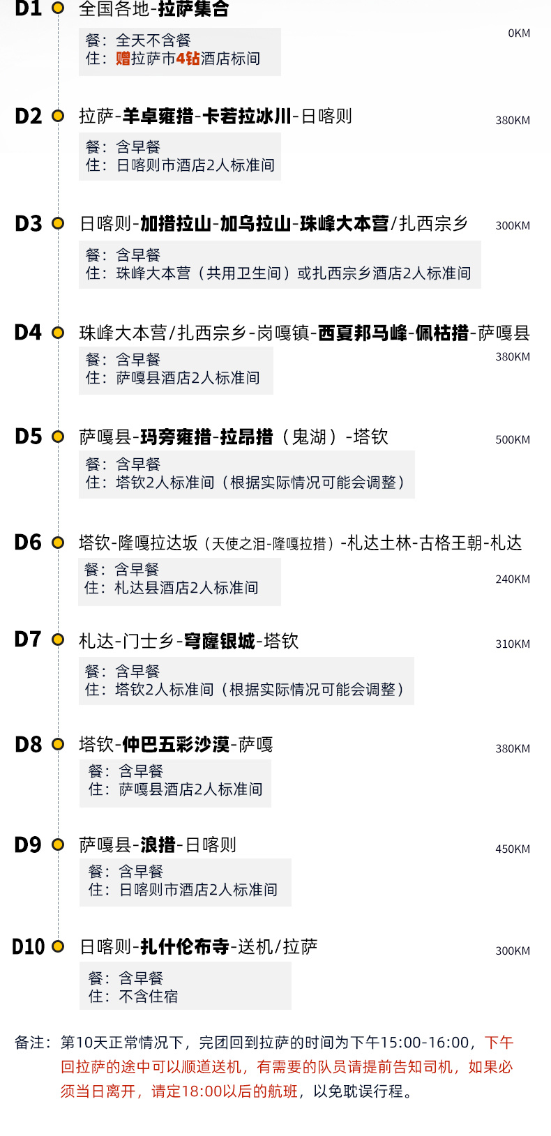 (1)以上行程及时间可能会因天气、路况等原因做相应调整,具体以实际出发行程及时间为准。正常情况下完团回到拉萨的时间为下午15:00-16:00,下午回拉萨的途中可以顺道送机,有需要的队员请提前告知司机,如果必须当日离开,请定18:00以后的航班,以免耽误行程。