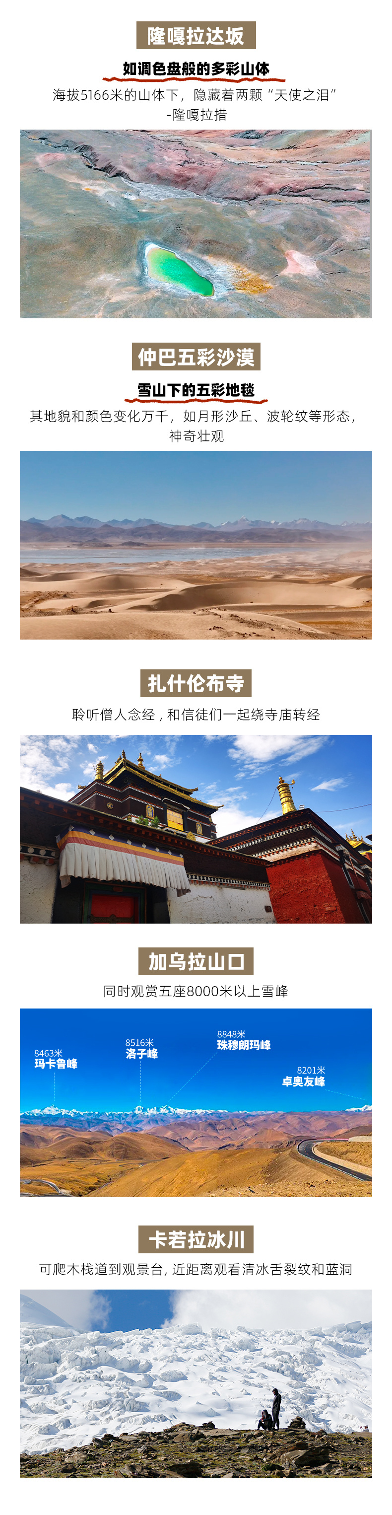 【行程概述】早餐后,先沿国道G318到达拉孜县,风景越来越美,首先到达的是【加错拉山】,西藏拉孜藏刀作为藏刀公认的第一品牌,许多人慕名求购。接着穿越珠峰公路,体验著名的【108拐盘山公路】,在蜿蜒上升中感受驾驶乐趣与壮丽景色。驱车来到【加乌拉山口】,在世界级观景台一次性远眺马卡鲁峰、洛子峰、珠穆朗玛峰、卓奥友峰四座8000米以上雪峰。观赏完后前往珠峰大本营打卡,在世界之巅的脚下,近距离感受珠峰的震撼,并在8848米测量纪念碑前留念。晚上如果想拍星空,一定要在珠峰大本营过夜。