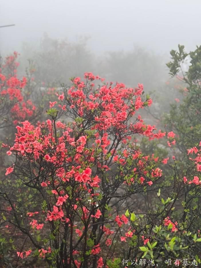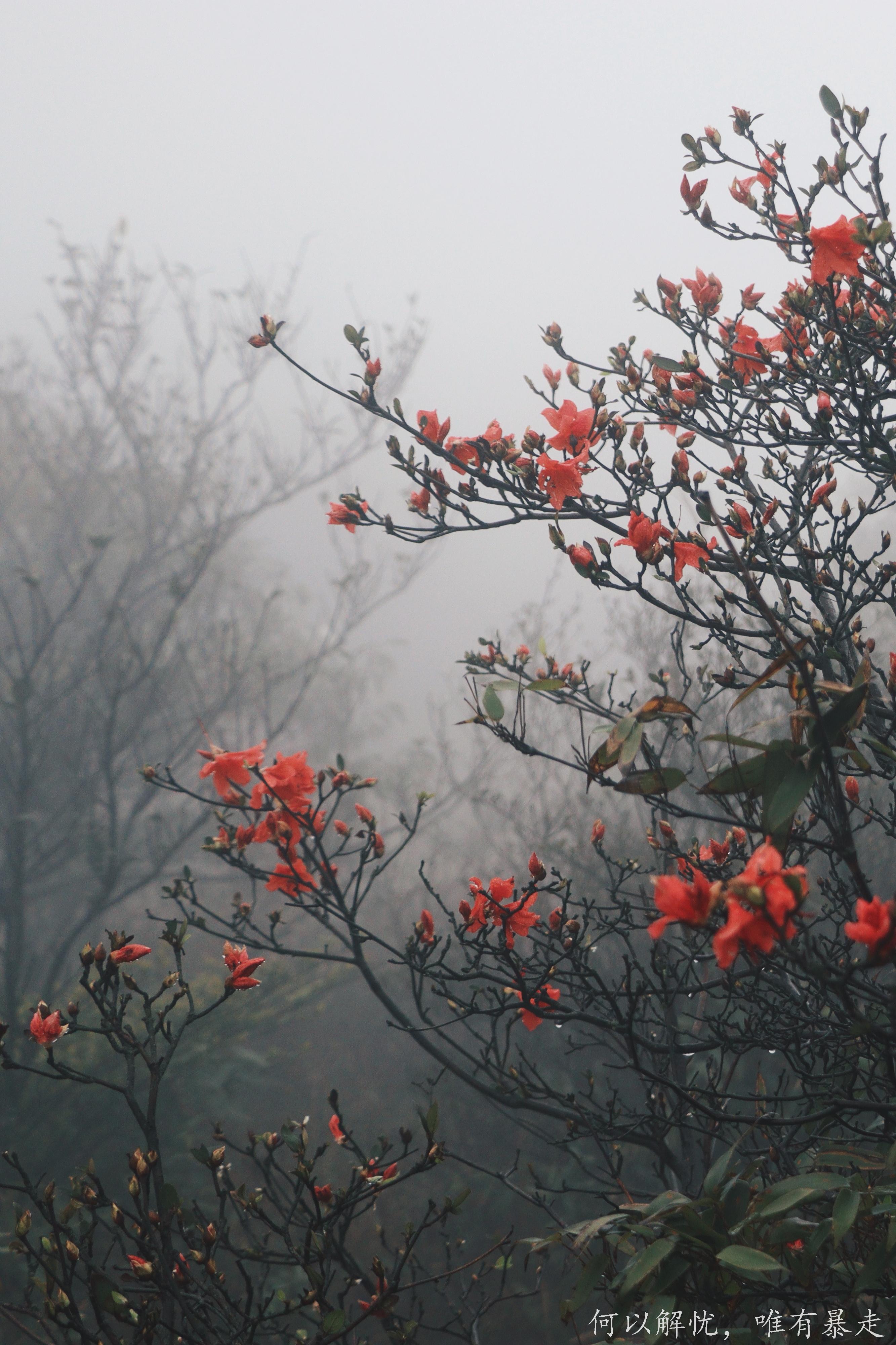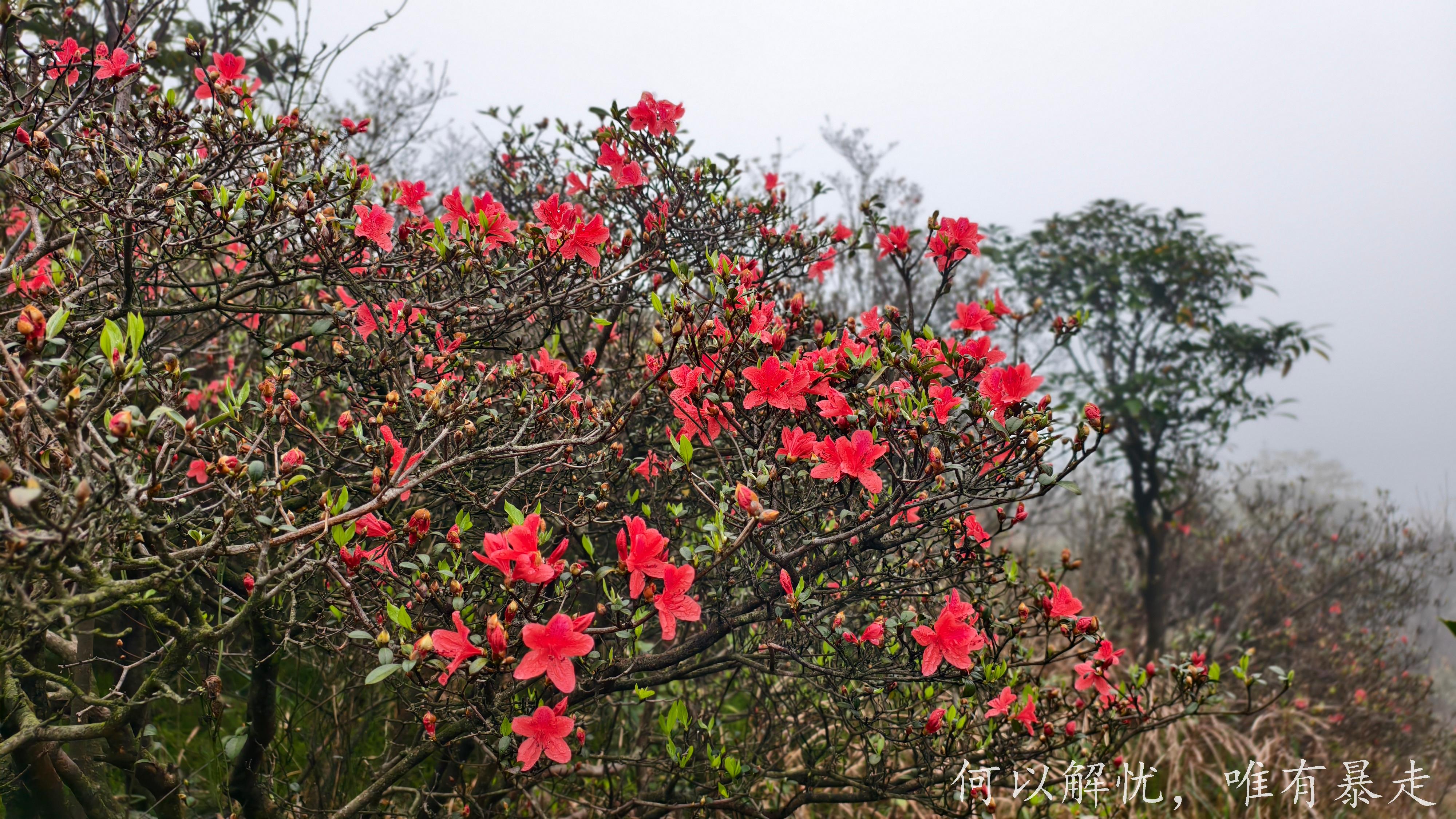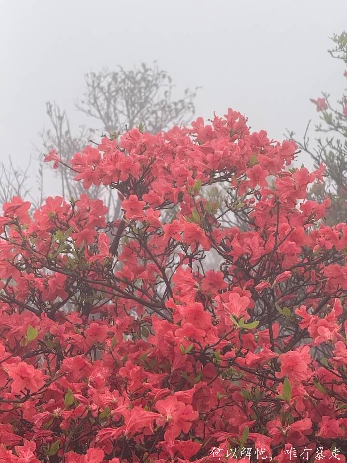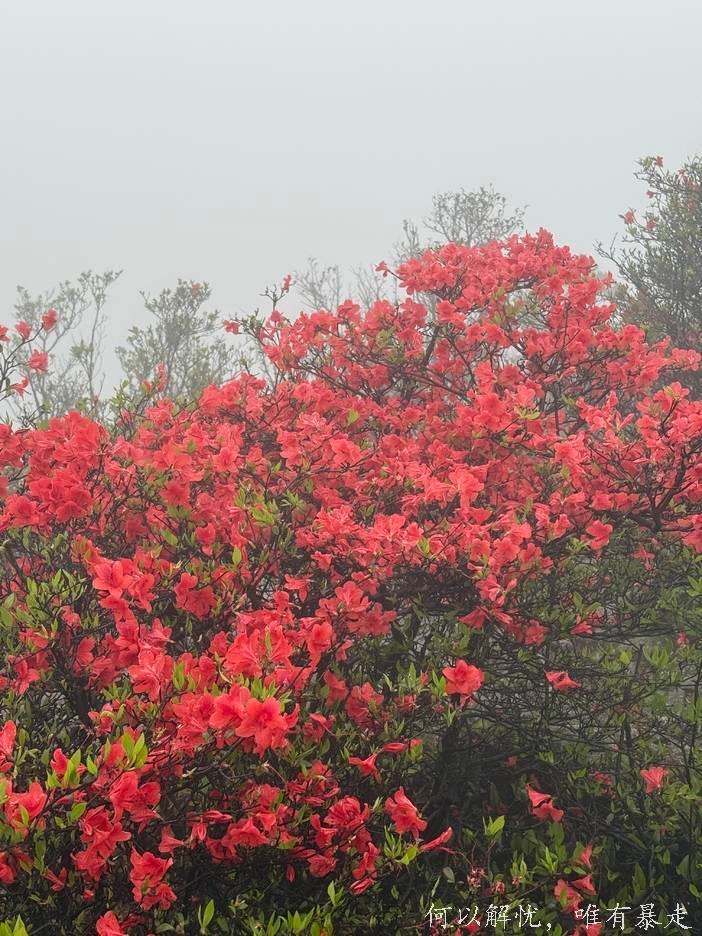 亮点2:望军山的野生高山杜鹃面积广阔,如大杂顶的杜鹃花海总面积约有 500 亩,顺着平缓的山坡密集生长。每当盛花期,铺天盖地的映山红一丛丛、一簇簇盛情绽放,染红整个山头,场面极为壮观