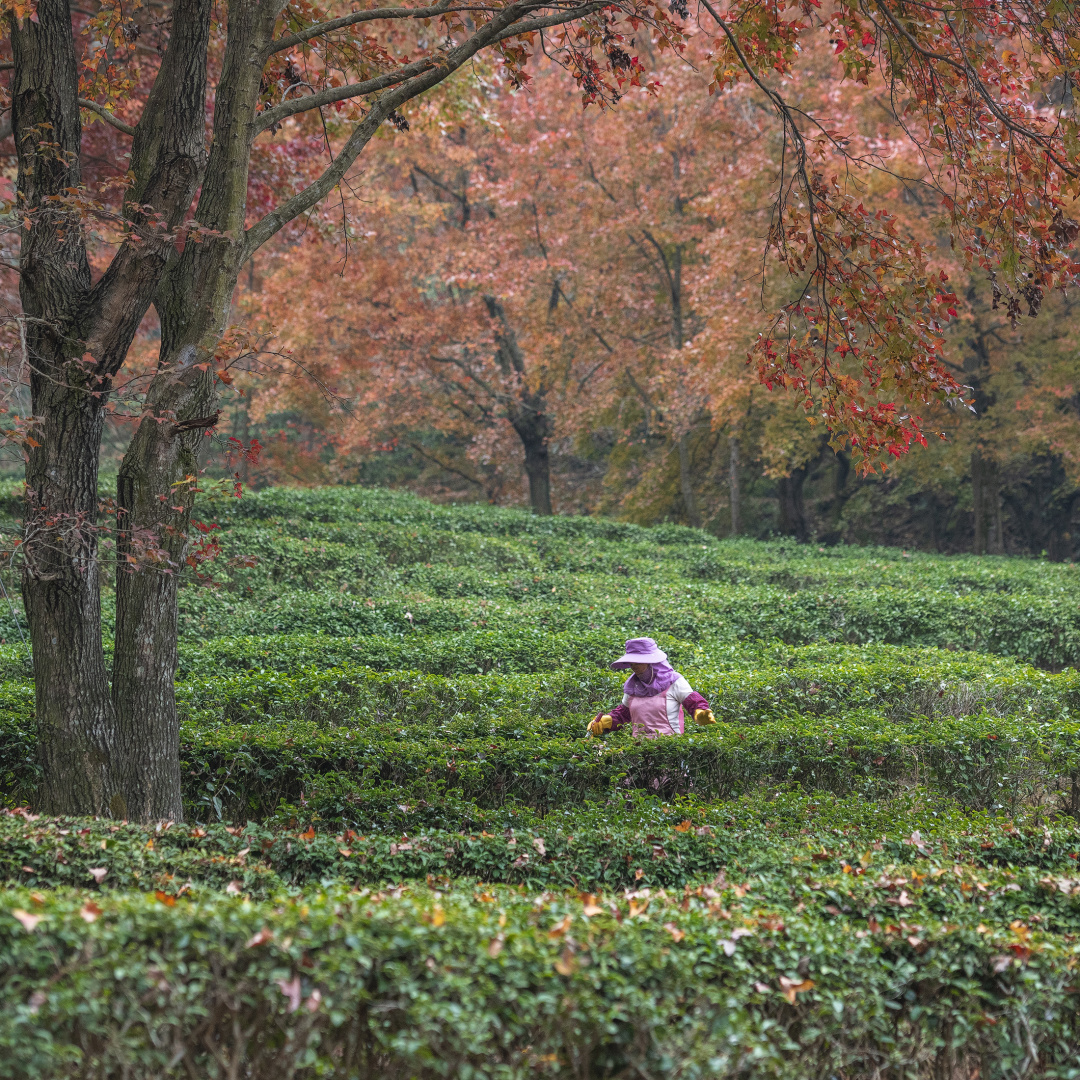 上百颗枫树点缀在半山茶园之间