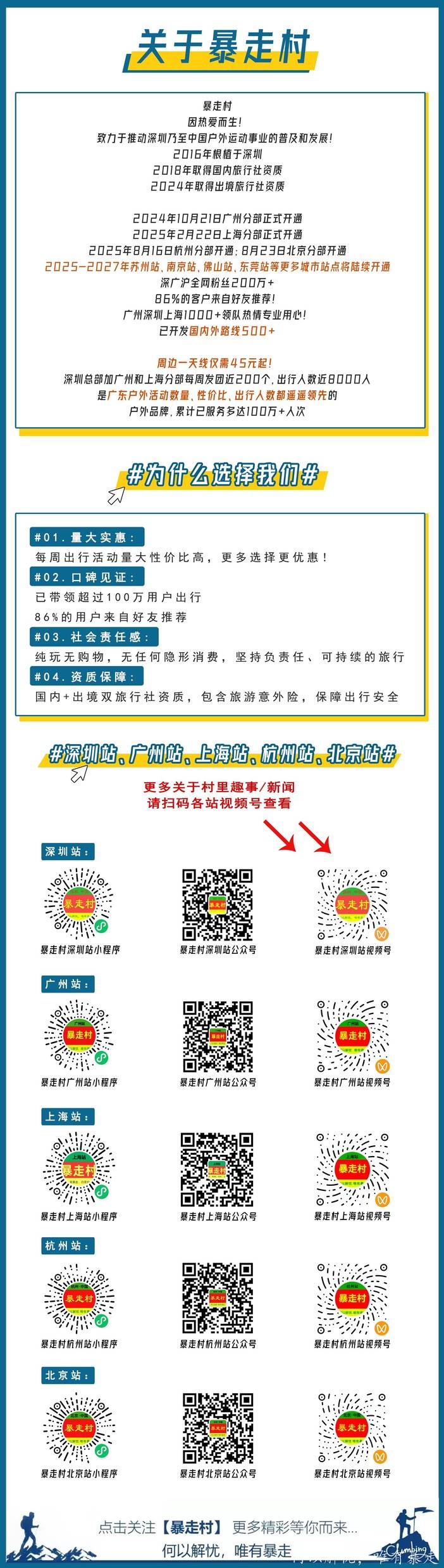 9. 户外活动有各种不确定因素,具有一定风险。此次活动为自发性质户外活动,请活动参与者按照领队安排线路,活动线路以外组织者不提供任何活动保障,人身财产安全责任自行承担,与组织者和队友无关。活动最终解释权归暴走村所有。