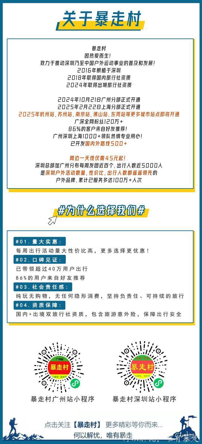 9. 户外活动有各种不确定因素,具有一定风险。此次活动为自发性质户外活动,请活动参与者按照领队安排线路,活动线路以外组织者不提供任何活动保障,人身财产安全责任自行承担,与组织者和队友无关。活动最终解释权归暴走村所有。