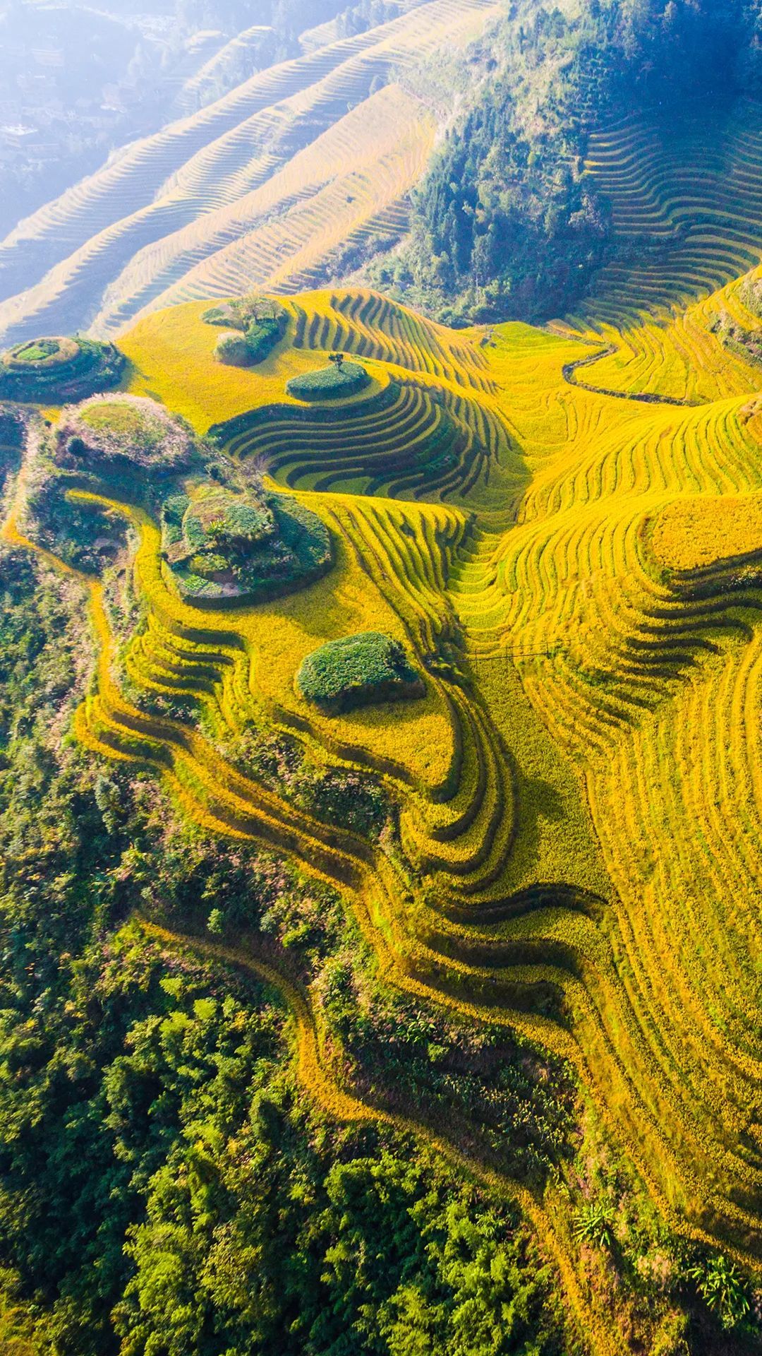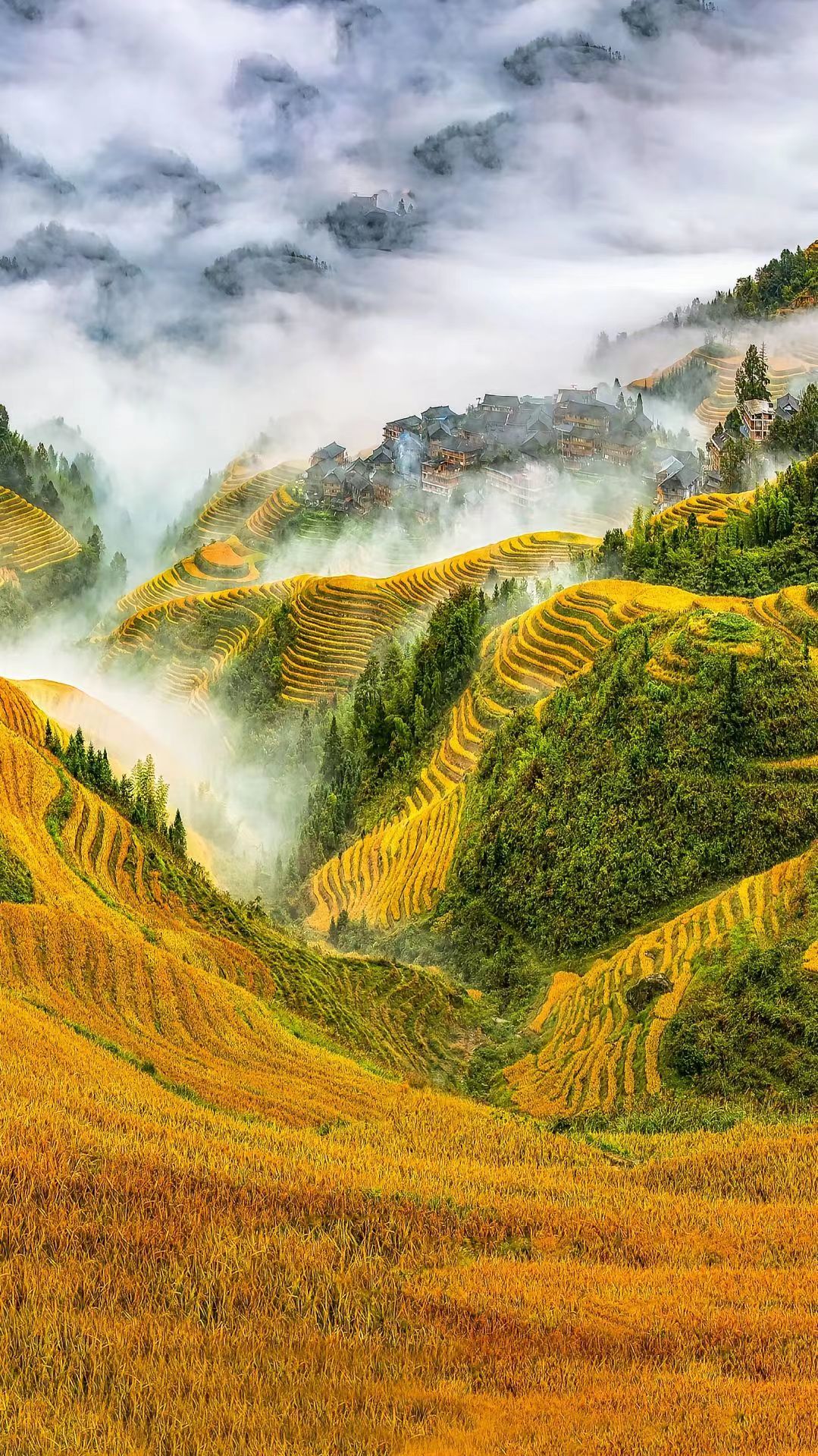 2.龙脊平安寨梯田+古壮寨梯田双梯田秋天,是龙脊最美的季节,如同黄金飘带般的稻浪,在微风中此起彼伏,往上看直拍天际,往下望如大海扬波..