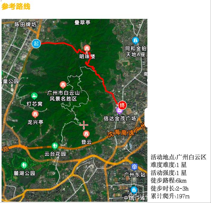 东门梅花园门岗-白云松涛--明珠湖--白云山西门,全程约6公里,耗时约2-3小时