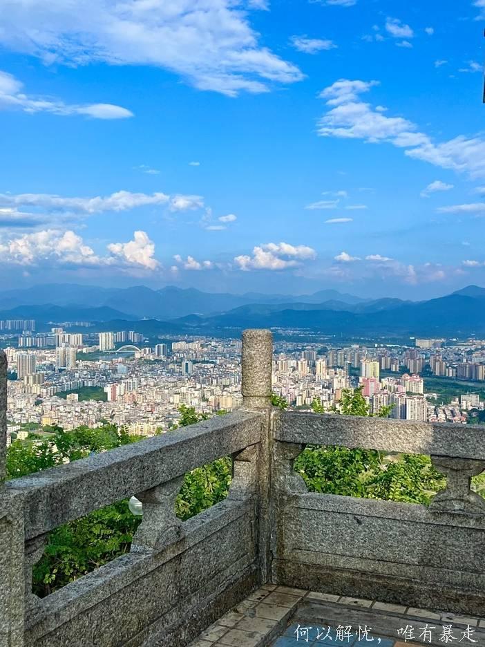 登上高处,错落有致的城景尽收眼底,蜿蜒的流溪河如碧绿丝带穿梭其间,让人心旷神怡。
