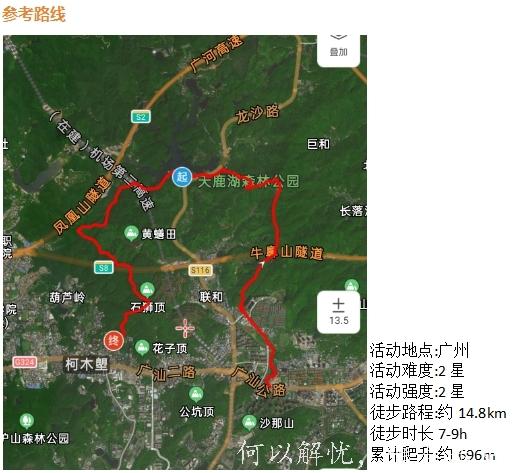 徒步穿越线由黄陂地铁站D出口起点至高塘石地铁站D出口终点,全程14.8公里。