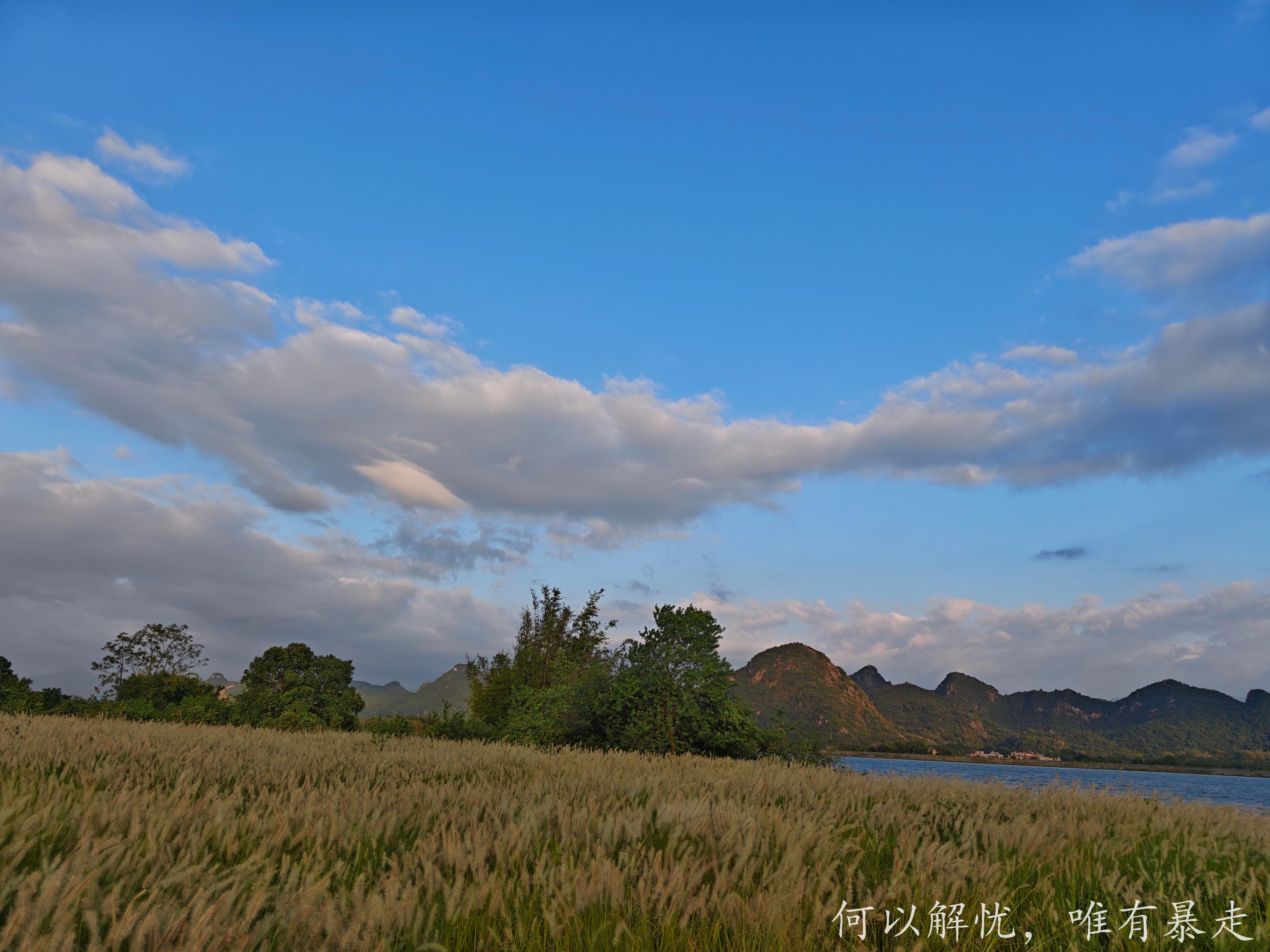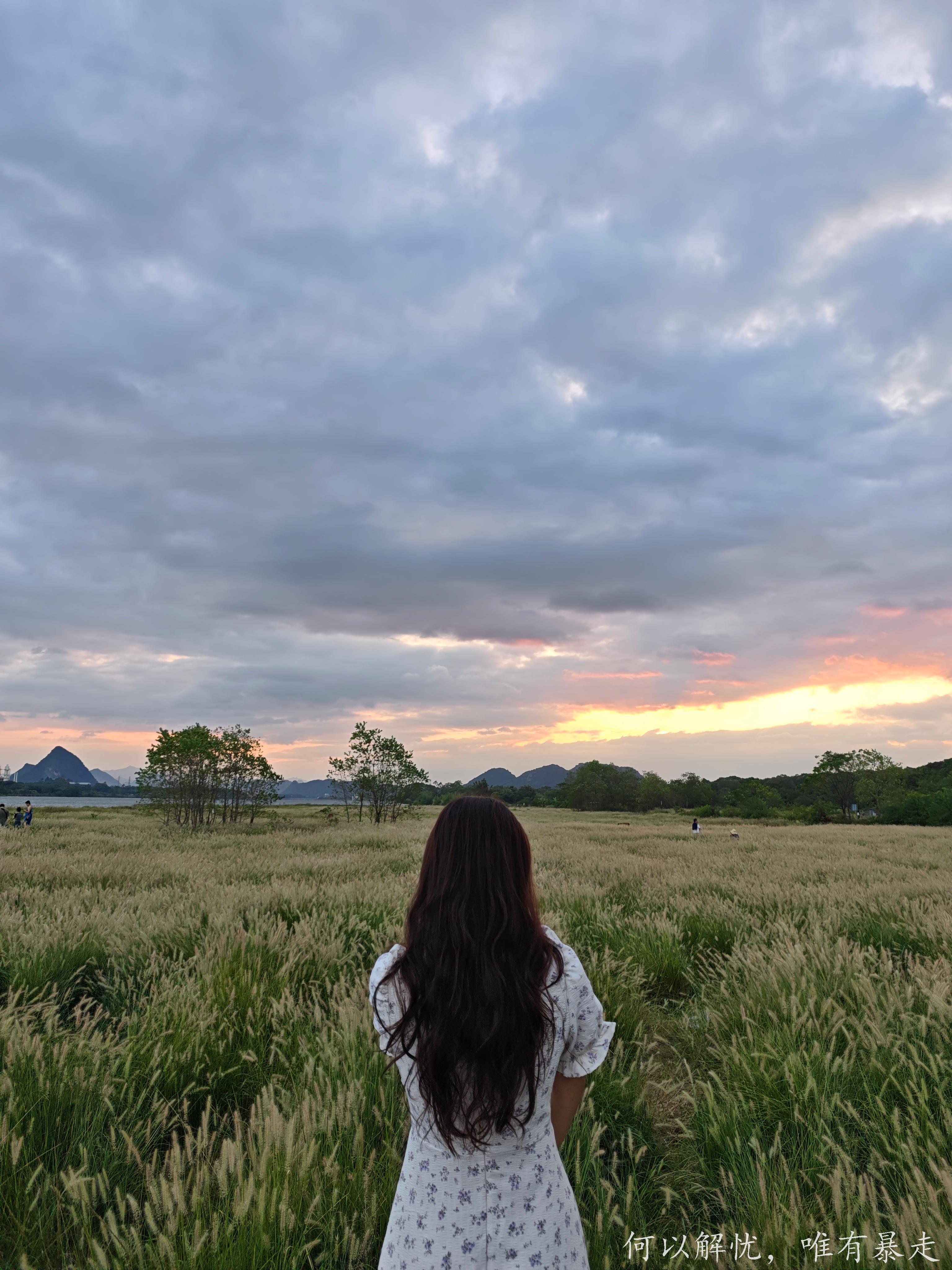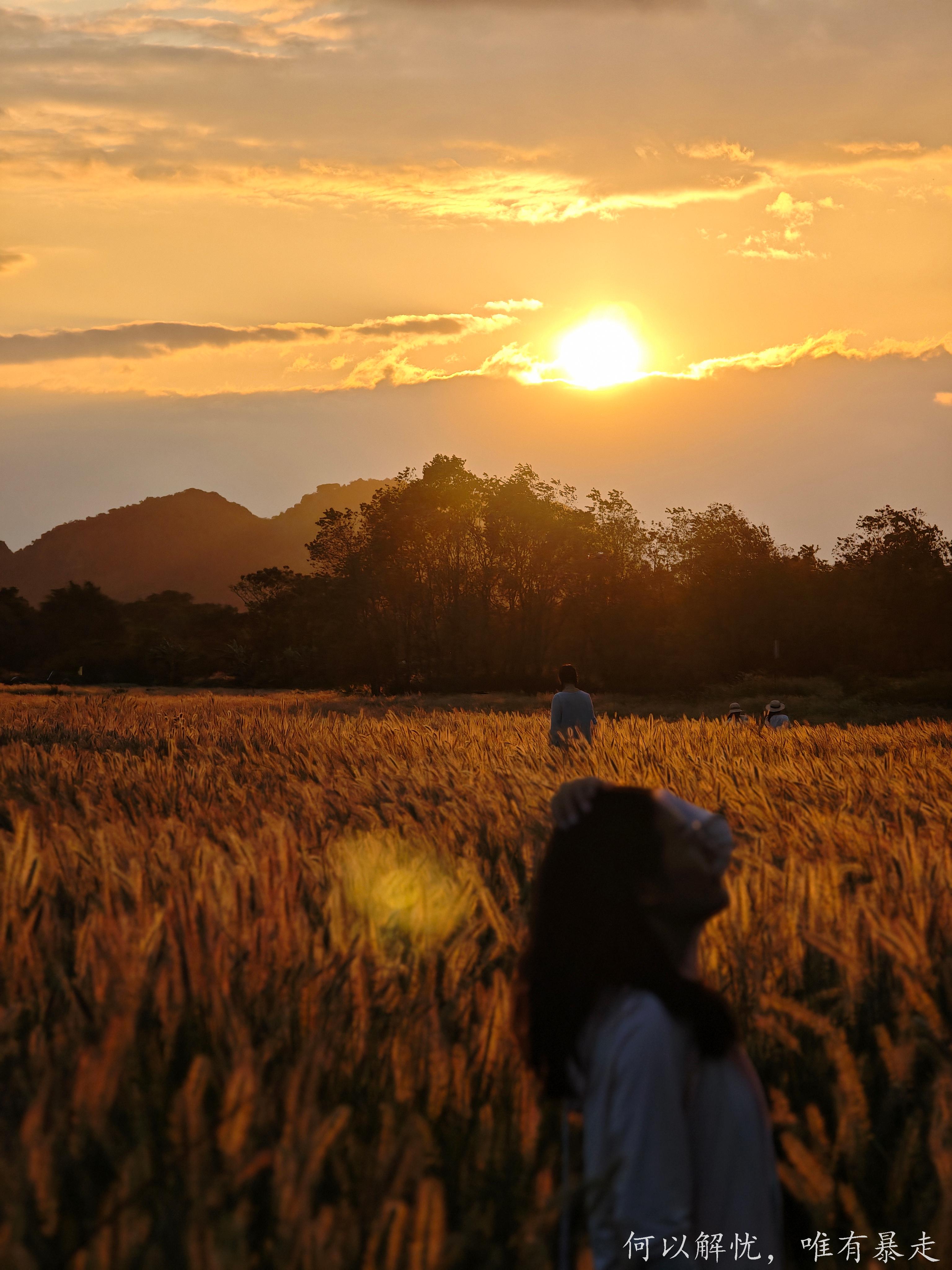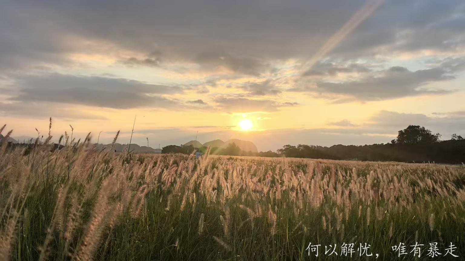 亮点3:北江河畔的百亩狗尾巴草所在地,长势旺盛,形成了一片壮观的草海。在夕阳的映衬下,金黄色的狗尾巴草花穗随风摇曳,美不胜收。