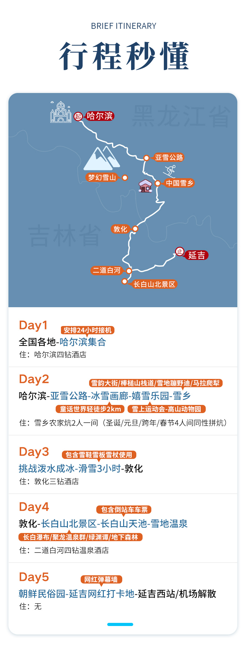 1、住宿:哈尔滨4钻酒店标间1晚,敦化4钻酒店标间1晚,雪乡农家炕2人一间(圣诞元旦跨年春节团期同性4人间拼炕),二道镇4钻温泉酒店标间1晚;