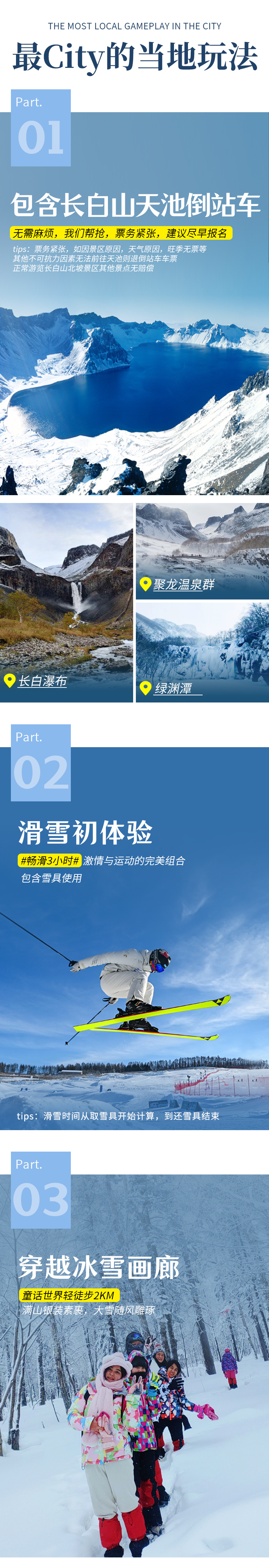 4、门票:雪乡门票+往返环保车、冰雪画廊轻徒步门票、朝鲜民俗园门票、长白山北景区全含(门票+往返环保车+摆渡车+天池倒站车)、雪乡滑雪3小时包含雪鞋雪板雪杖使用(滑雪时间从取雪具开始计算,到还雪具结束);