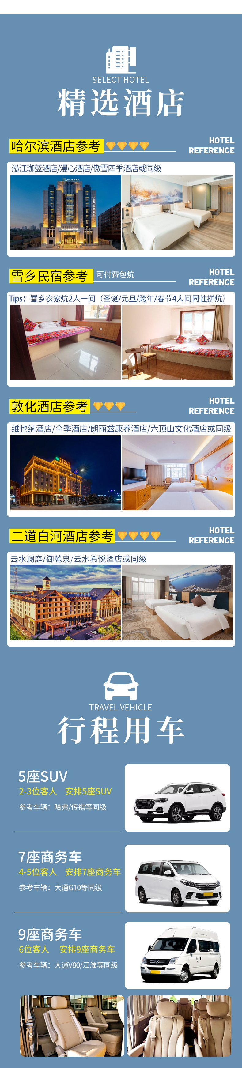 3、用车:2-3客人用5座SUV,4-5客人用7座商务车,6客人用9座商务车,7-8客人用大九座商务车,根据人数安排用车大小,不指定用车(小团副驾驶及前后座位置需要轮流乘坐,望悉知)