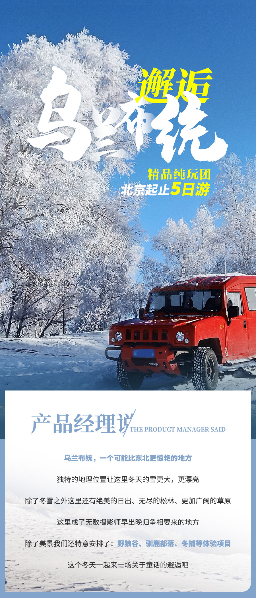 【交通】全程共用车费用(含司机、油费、过路费等等),北京往返乌兰布统根据人数安排车型:2-4人5座轿车或SUV、6-8人9座商务、9-14人15-22座小巴、15人-25人旅游大巴(15人以下司机师傅兼职领队,15人以上导游随团);乌兰布统安排越野车雪地穿越。