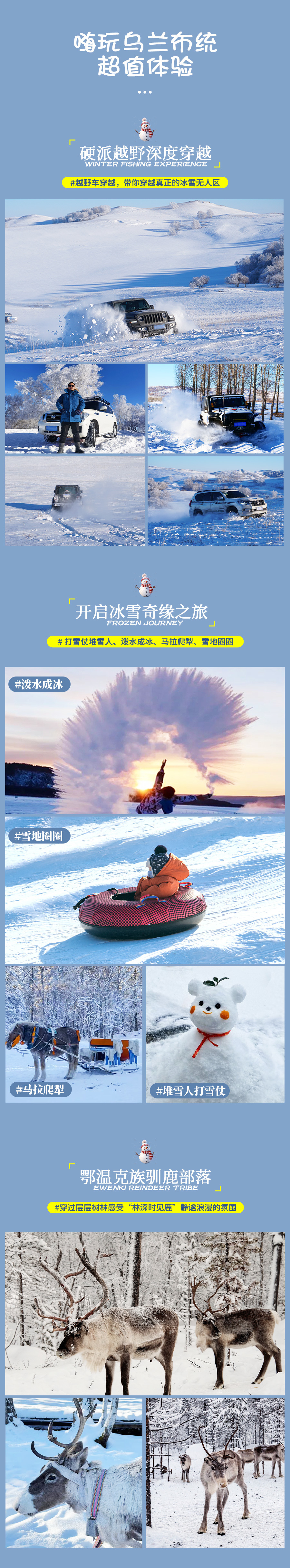然后开始一天的【乌兰布统雪地穿越】,在没有路的路上穿越,一眼望去全是白色仿佛进入了童话世界,而且我们走的路线的雪都是没怎么被踩过的地方。穿越无人区,体验越野与冰雪的刺激。之后体验刺激好玩越野车【冰上漂移】,在雪地上冰面上肆意驰骋,让我抛弃一切的烦恼,一起感受自由,放飞自我。