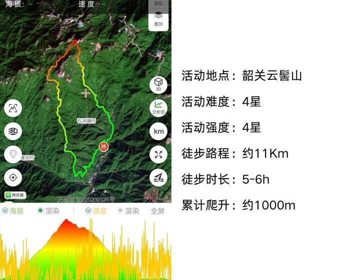 中等难度,起点终点相同,都是云髻山景区门口,全程约11公里,累计爬升1025米,最高海拔1434.2米,总耗时4-6小时。