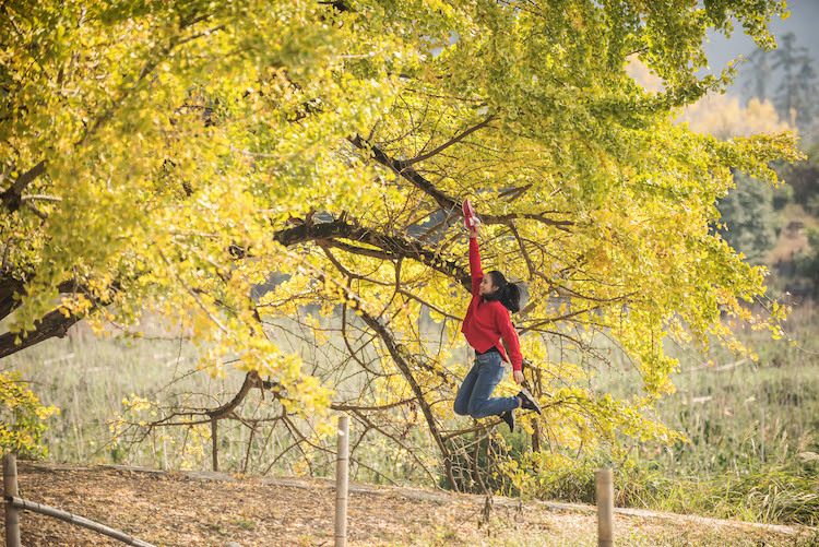 漫步其中,金黄树叶从头顶飘落、铺满路面,人仿佛被整片秋色包裹,
