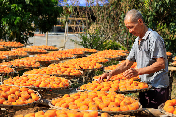 柿子丰收时,当地农民趁着晴好天气收柿子、晒柿子,每家门前院里晒满了柿子,房前屋后遍地金黄,好一副晒秋画卷。