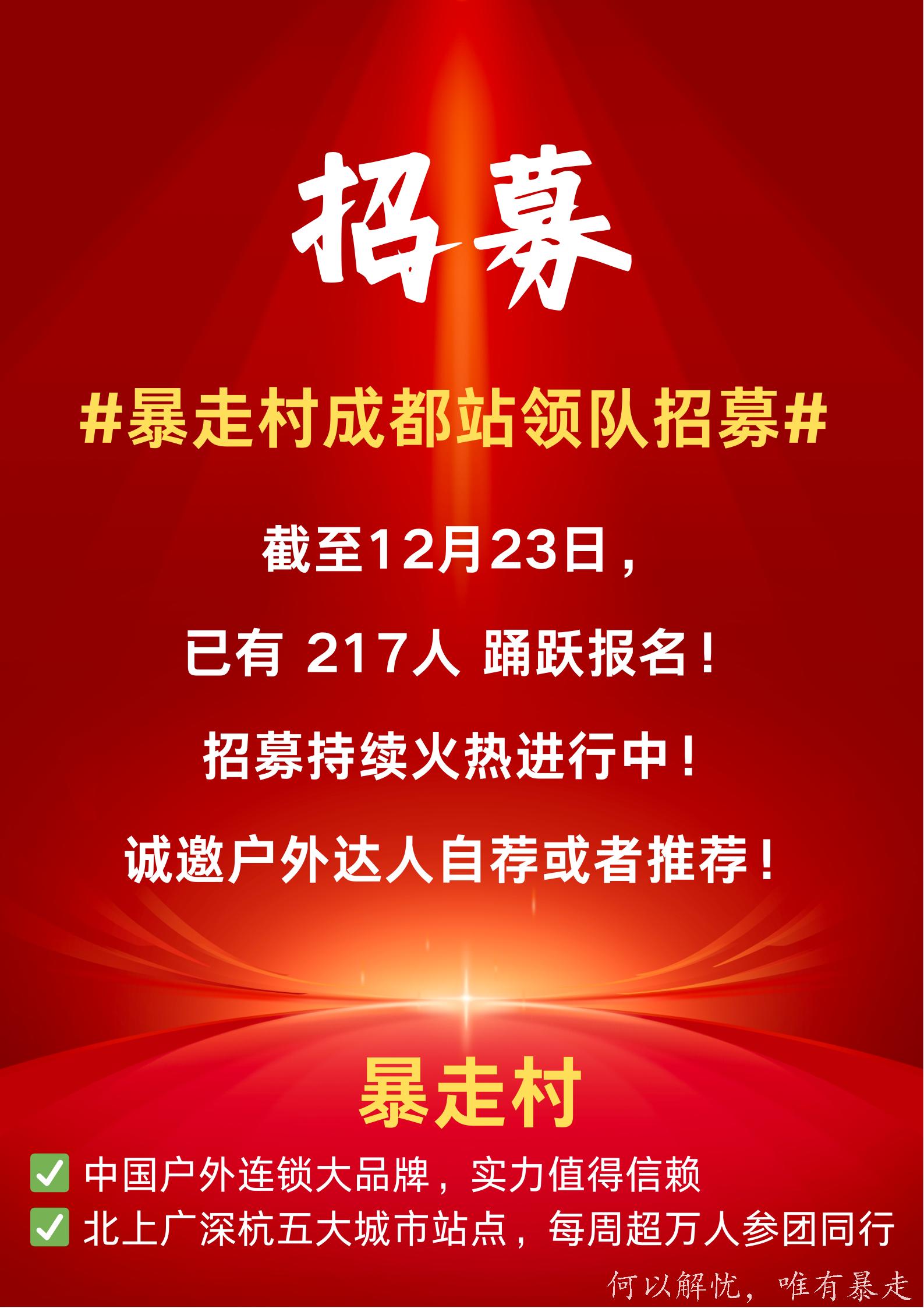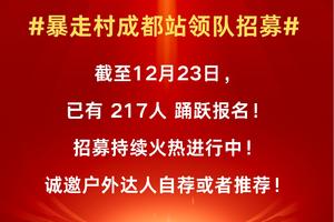 暴走村成都站,截至12月23日, 已有 217人 踊跃报名! 招募持续火热进行中! [复制链接]