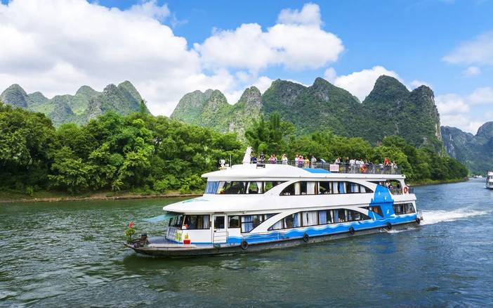 乘游船游览国家AAAAA级景区【大漓江风光】沿着这条青绸绿带,盘绕在万点峰峦之间,其中奇峰夹岸、碧水萦回、削壁垂河、青山浮水、风光旖旎、犹如一幅百里的画卷,