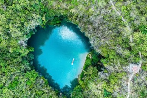 三门海由7个岩溶天窗,是串珠式天窗群,目前只有三个天窗由自然通道可乘船入内,加上蓝得像海的水使人感觉到山中有海、海上有门,“三门海”也因此而得名,这里是梦幻蓝色秘境。