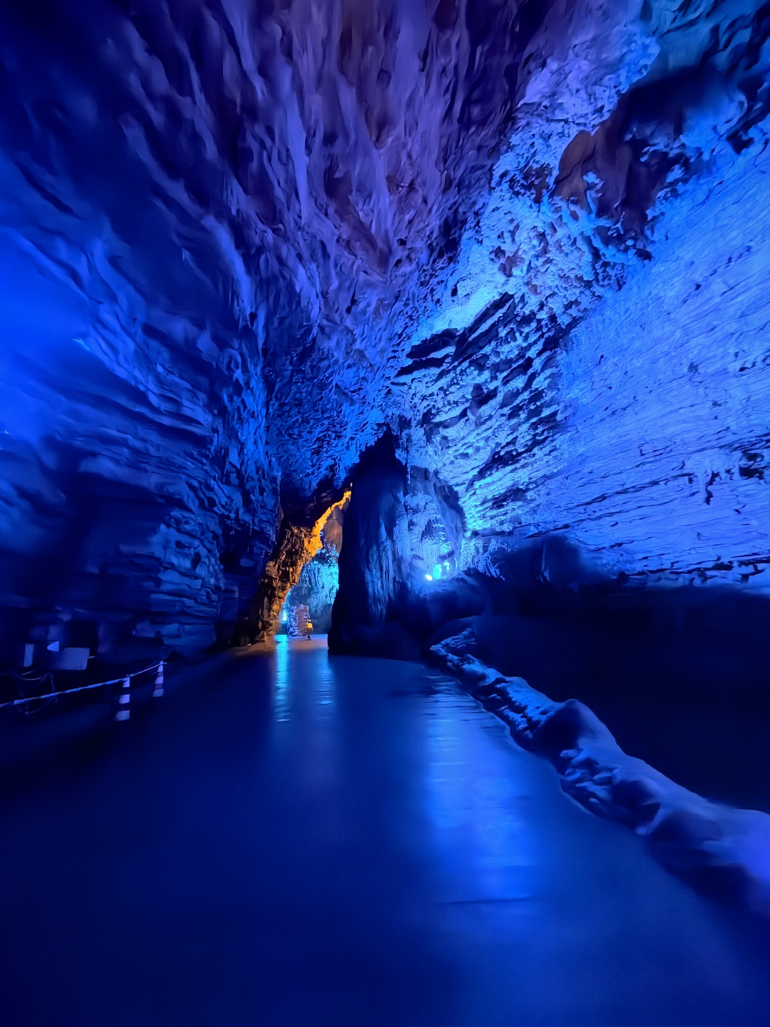 低头俯瞰,脚下是暗流涌动的地下河,清澈的河水倒映上方的钟乳石,虚实交错间更添几分神秘与幽邃。洞中恒温16℃左右,能让你在大自然的空调房中卸下一身暑气。