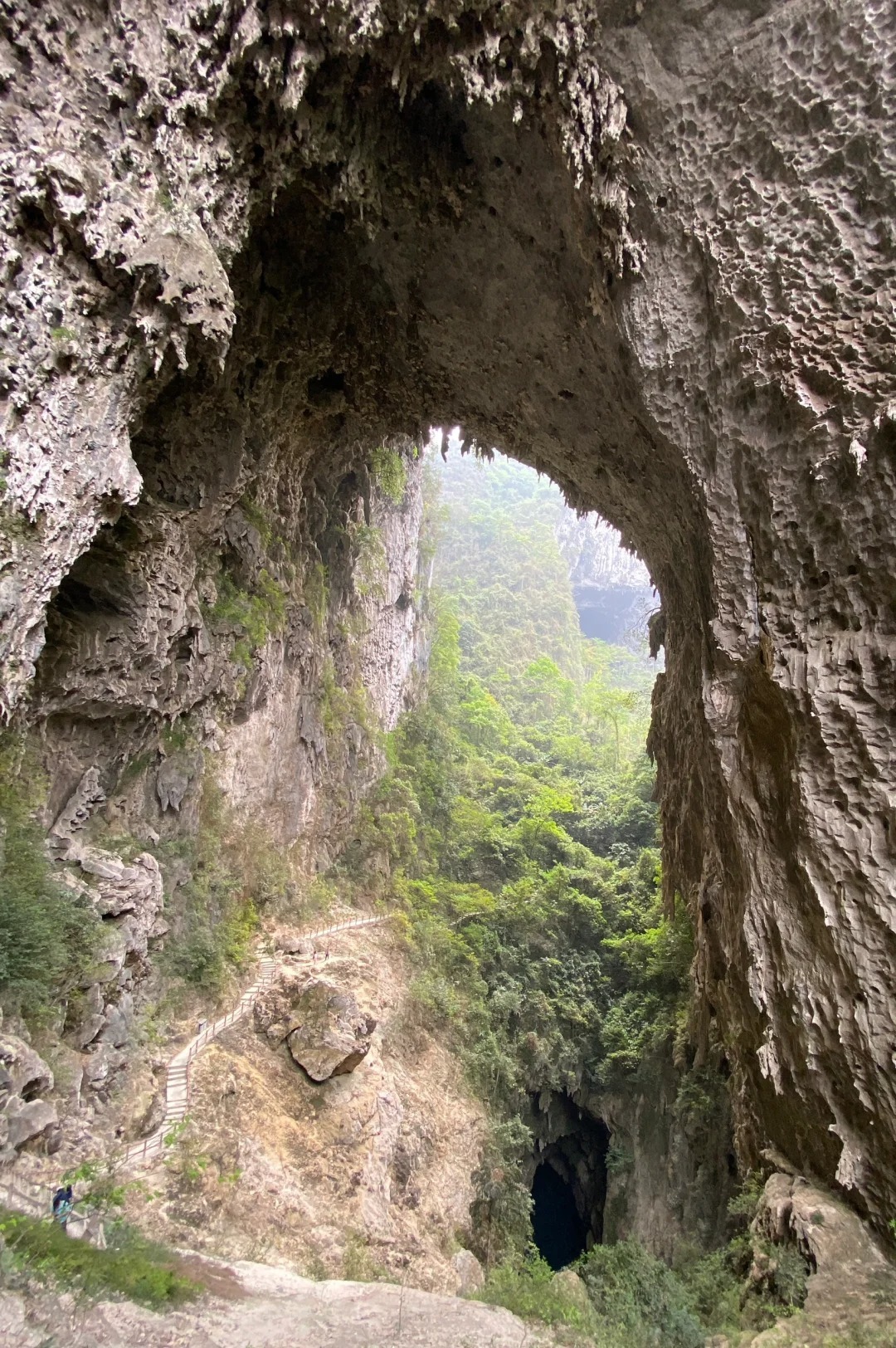 沿着步道往上会经过飞龙穿洞,洞长193米,宽44-62米,高54-100米,洞顶上石钟乳发育,造型奇异,似龙爪倒吊。