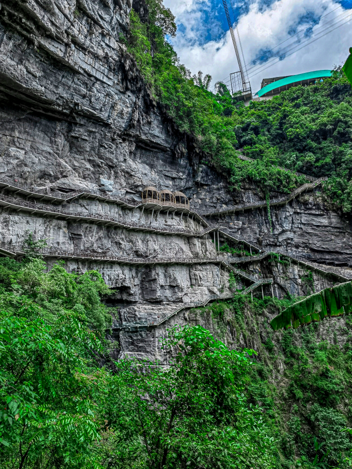 棉花天坑,深326米,宽305米,形似大型漏斗,一削千丈的绝壁直插地下,栈道在悬臂上盘旋引向坑底,犹如地球表面与地宫世界的连接口,险、奇、峻、雄、秀、美!置身其中,如入秘境。