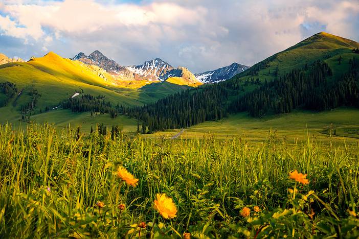 早上吃过早餐后驱车前往恰西,塞外江南在伊犁,伊犁最秀是恰西。恰西国家森林公园是著名林区,有着连绵不绝的雪岭云杉,国家农业展览馆陈列的“云杉王”截样就出自这里。夏天的恰西,水草丰茂、环境优美、牛羊成群,恰西河贯穿景区,两侧为中低山,远处是那拉提山诸高峰,东西两侧低山如垣,东侧山峦芳草绿茵,西侧山峦苍松凝翠,山顶角峰林立,冰山隐约可见。每到六七月,恰西草原进入一年之中最美季,水草丰茂,风景如画。一群群牛羊在蓝天、绿草间游动,恬静而悠然;星星点点的毡房,在湛蓝的天空下,于盈盈绿草间闪着耀眼的白光草原深处,苍鹰自由翱翔,草丛中,土拨鼠正悄悄张望。蓝天、白云、绿草、羊群、马群组成一幅大自然的神奇画卷。徜徉恰西草原,幽深的峡谷、蜿蜒的河水,皑皑的雪山、绿绿的草毯,挺拔的云杉、游荡的牛马......像是天地间的美好组合叠加在一起,屏蔽了尘世间的一切喧嚣。