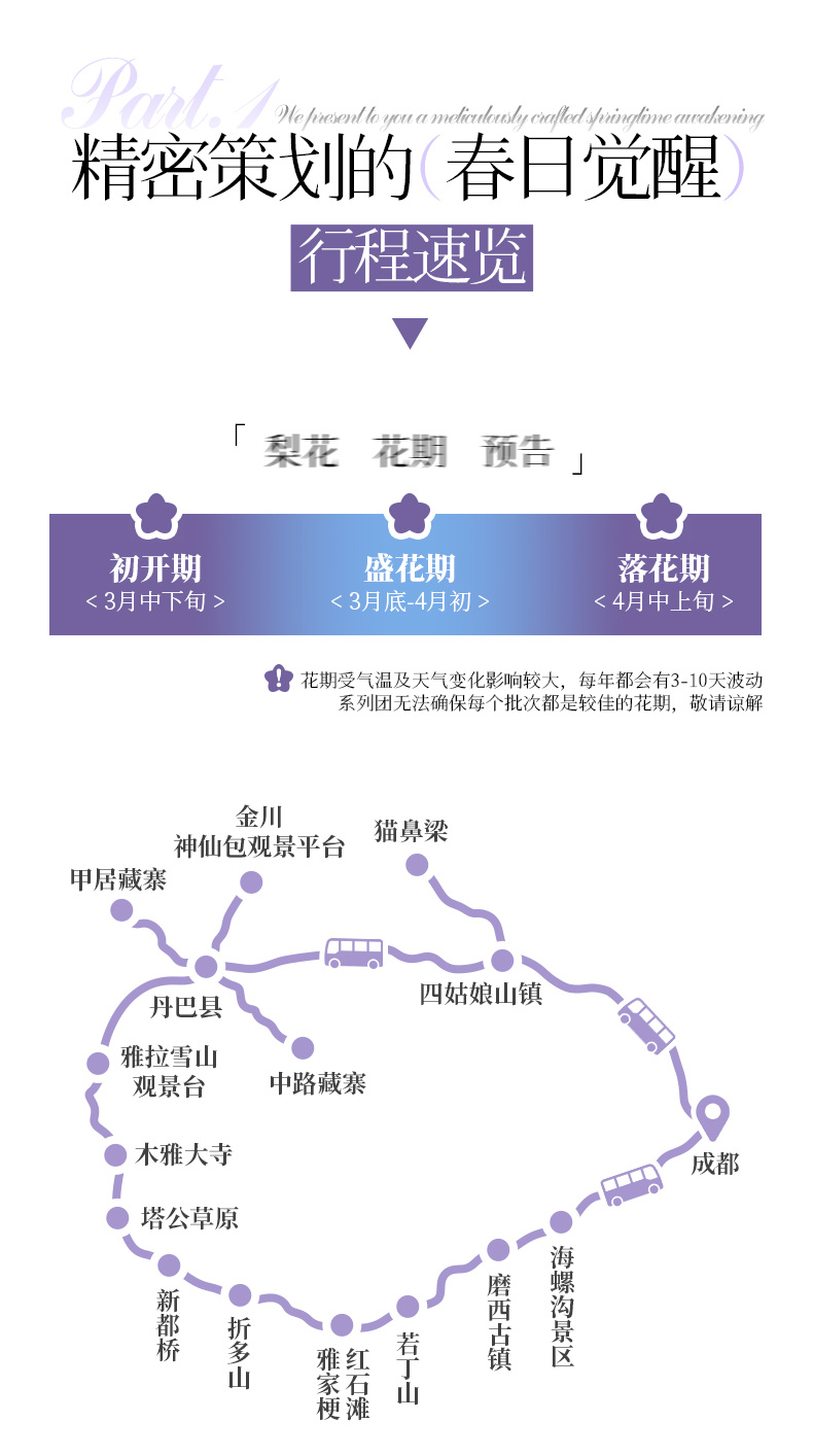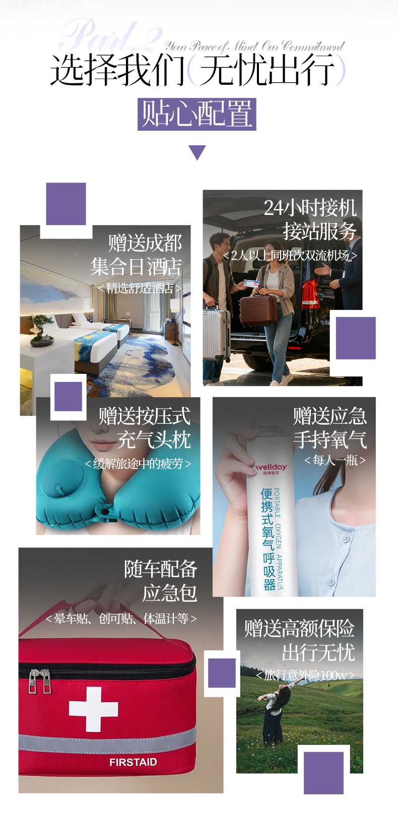 2、抵达成都时间约为18:00,由于川西的交通状况不是十分的理想,可能会因为修路、交通管制,堵车耽误时间,实际到达时间可能更晚。所以建议大家尽量购买次日离开成都的机票或火车票!