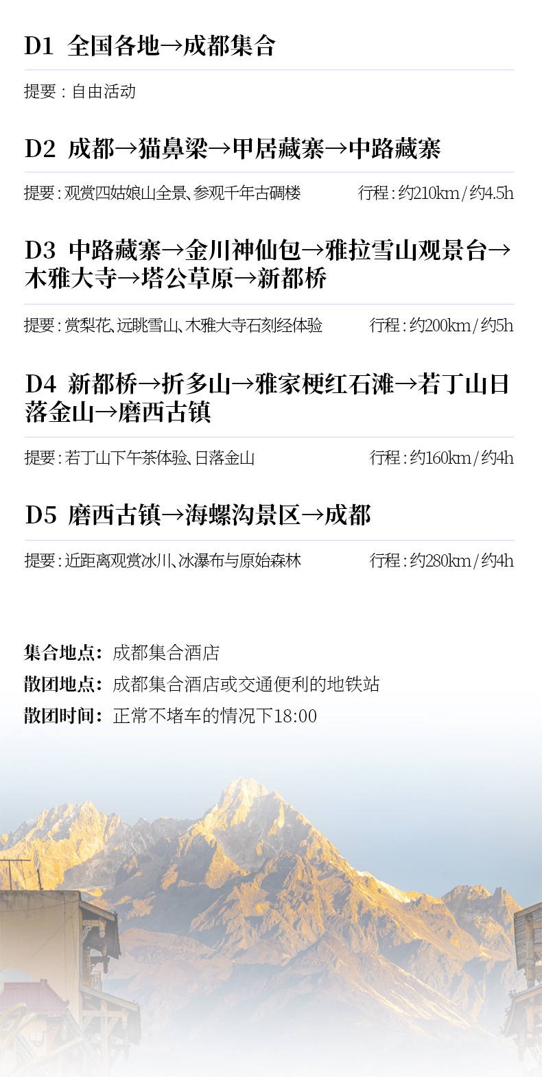 ▷ 海拔变化:磨西古镇约1600米→海螺沟景区约3600米→成都500米