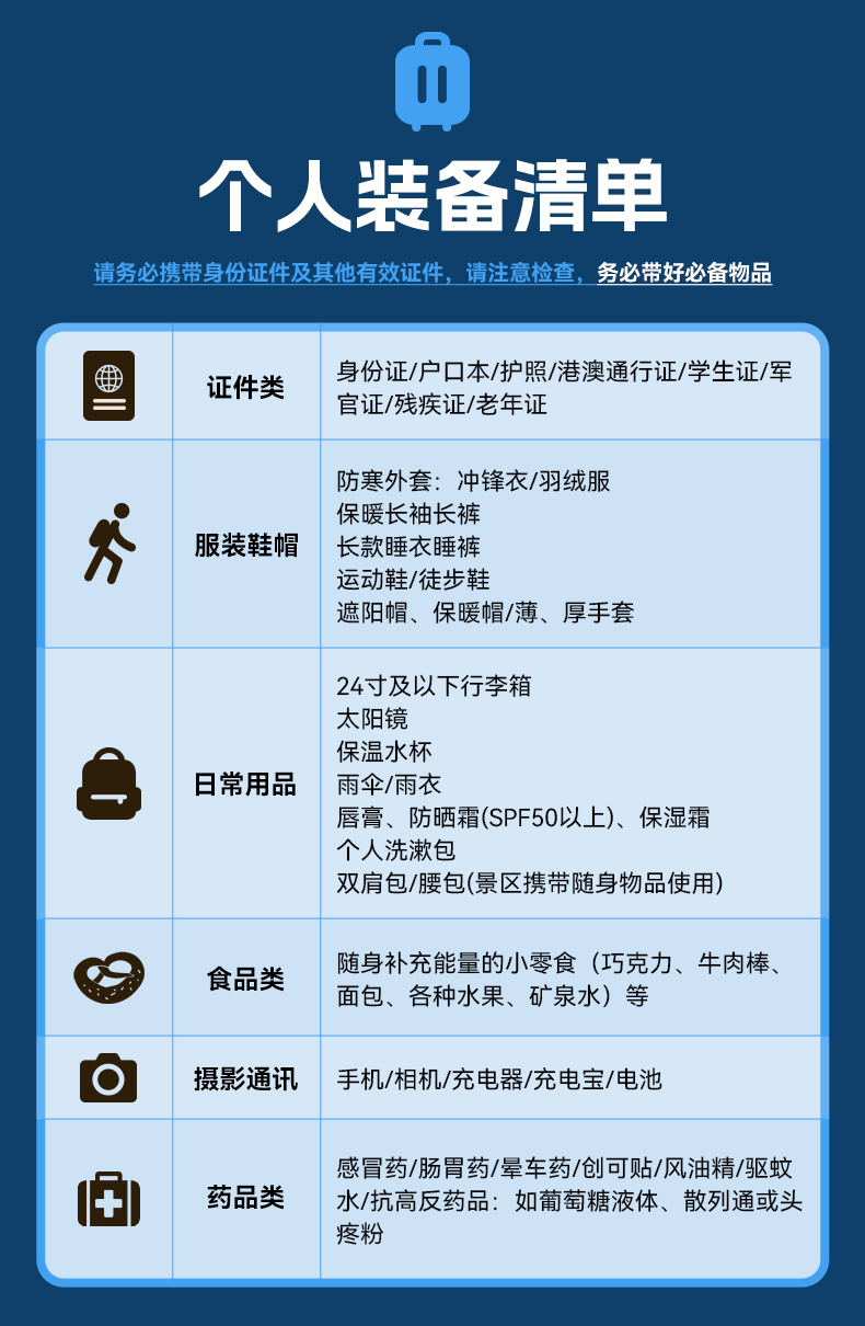 如持有老年证、军官证、士兵证、伤残证、学生证、国家级记者证等特殊证件,请在报名时告知报名客服且携原件出行,根据当地政策减免相关费用,如有优惠,现场退还相应差价;若因队员没有提前告知,旅行社则按正常票价购买门票,则无法退还相应差价,请悉知!