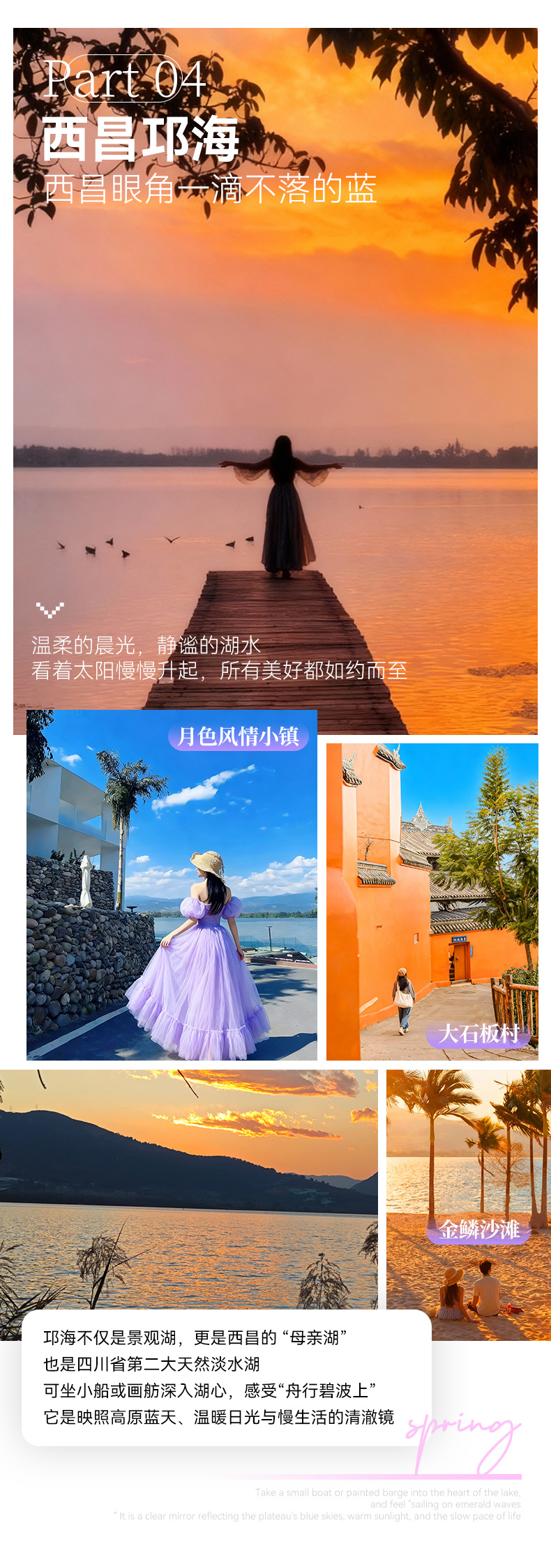 中午(12:00-13:30):前往邛海游玩: 自驾或骑行环湖,途经月色风情小镇,欣赏湖光山色。