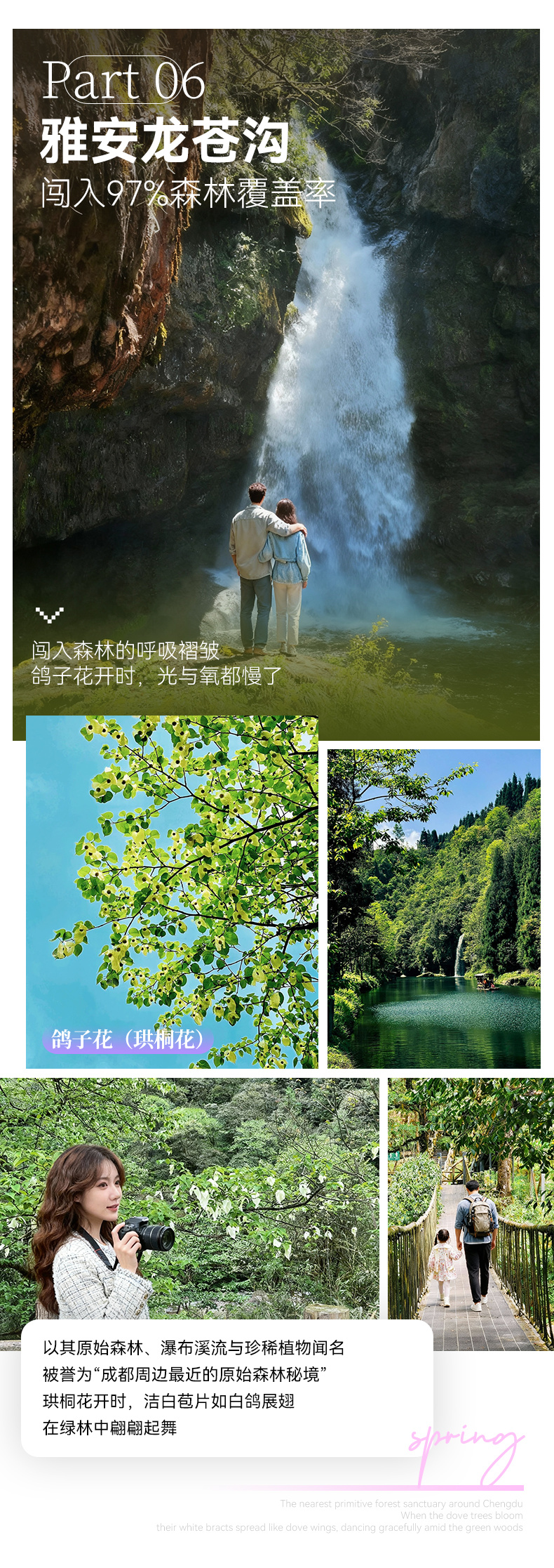 中午(11:00-14:00): 游览龙苍沟国家级森林公园,徒步观赏鸽子花(珙桐花,花期4-5月)、瀑布、原始森林(建议游玩2-3小时)。