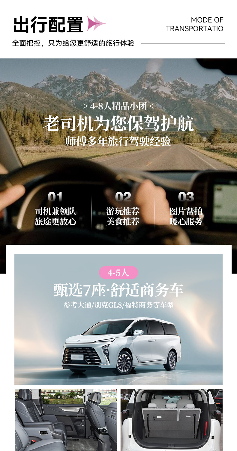 1. 交通:全程包车往返,根据人数安排合适车型