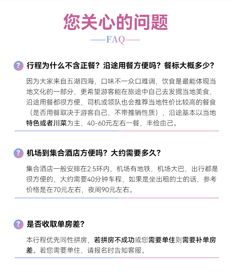 3、单房差:住宿默认安排2人/标间,单人报名优先安排同性拼房;如果要求一个人单独住或拼房不成功,则需补交单房差费用。