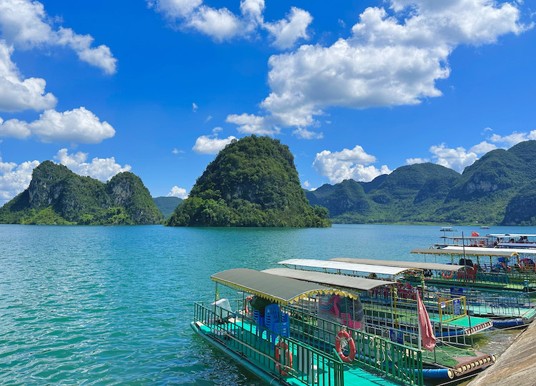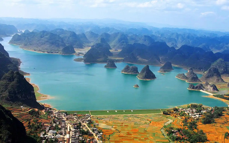 它被誉为"水上桂林"、"大里的海洋”。湖中有十多个大小岛屿,四周环绕着喀斯特峰林,沿岸点缀着几百个壮族干栏式村寨,湖面平静如镜,景色如画。