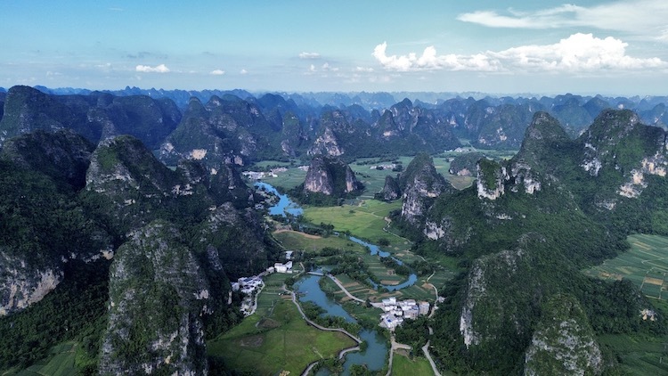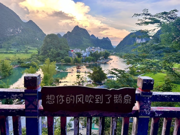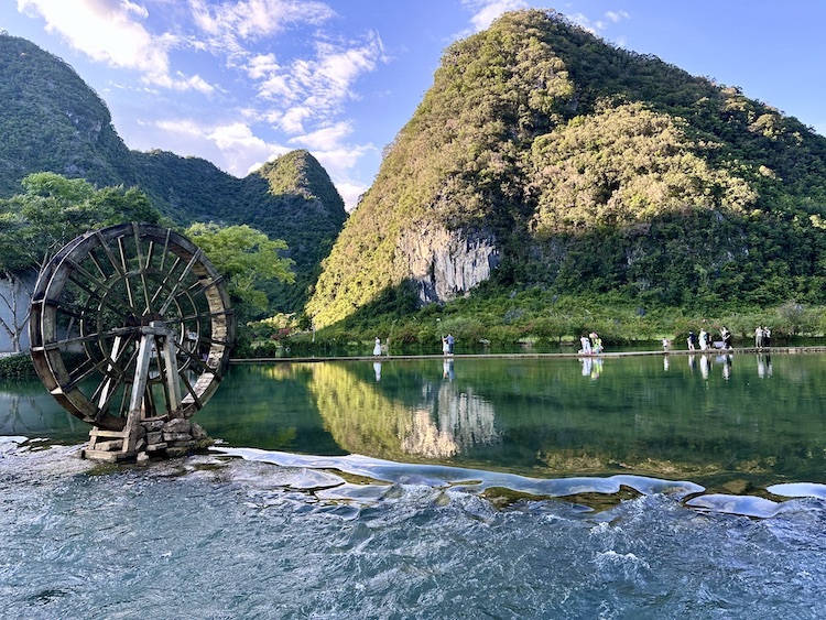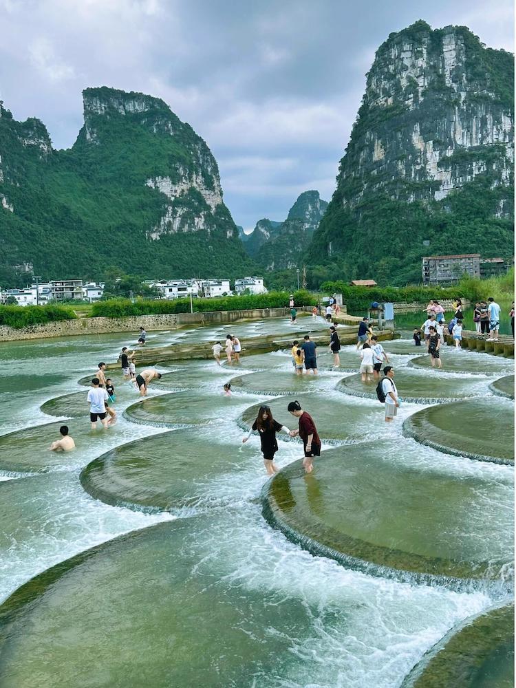半山观景台可俯瞰泉池、稻田与喀斯特峰林全景