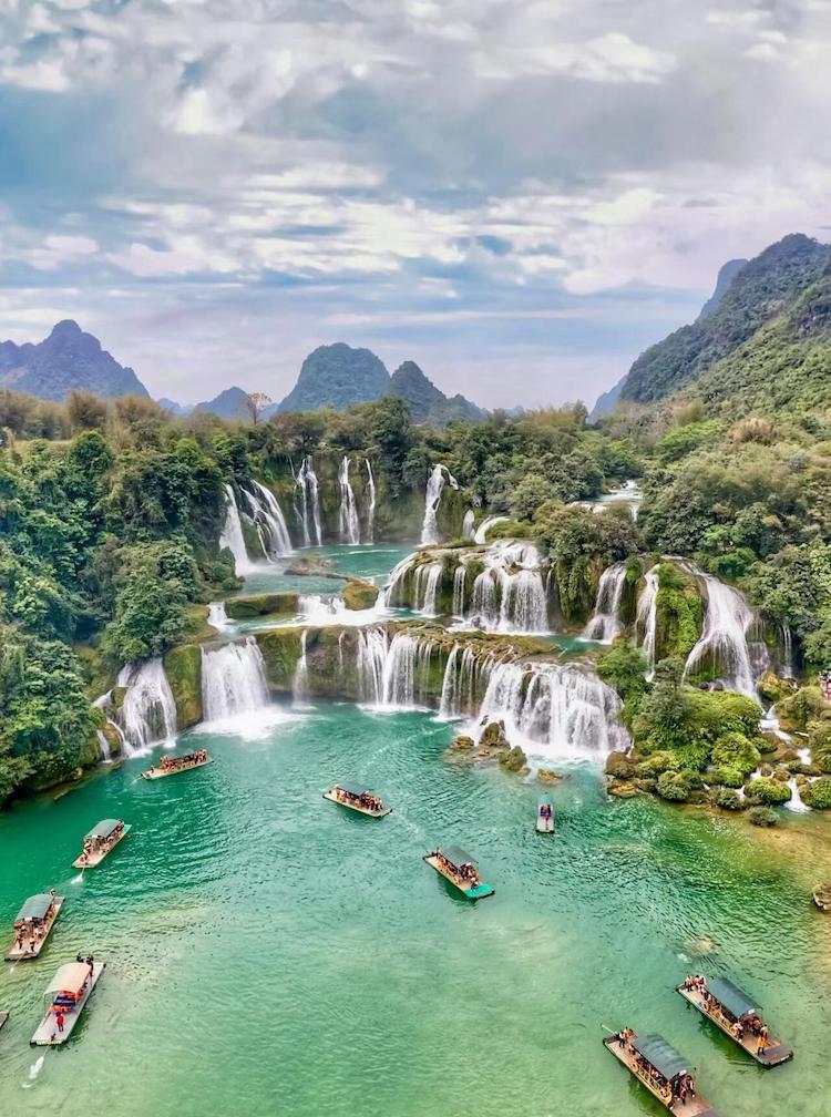 07:30 退房上车,前往【德天跨国瀑布】景区,1.5小时车程。约9点到达景区服务中心,购票后,转乘景交车进入景区,检票后即可近距离浏览著名的亚洲第一、世界第四的跨国大瀑布,瀑布横跨中、越两国,38道大小不一的急流从不同角度飞泻而下,呈三级跌落。景区内设有多个不同角度观景台,让你拍照不用愁。
