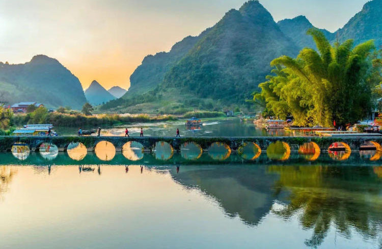 15:00 前往【鹅泉】风景区,1小时车程。这是中国西南部的三大名泉之一,也是德天瀑布的源头。地方虽不大,但各个角度都能拍出漂亮美景。可乘竹筏穿越古桥洞,近距离观察黑天鹅、白鹅与水生动植物。半山观景台可俯瞰泉池、稻田与喀斯特峰林全景。