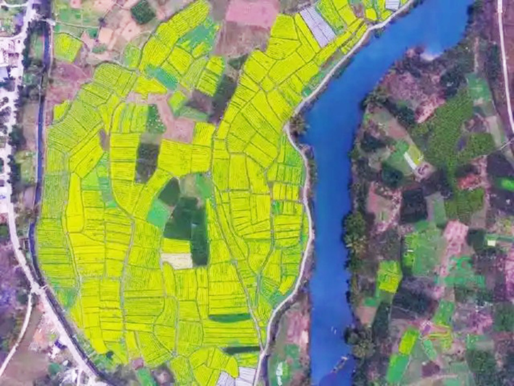 遇龙河两岸,3000亩油菜花如同金色的波浪,随风起舞。春日里,正是盛花时节。