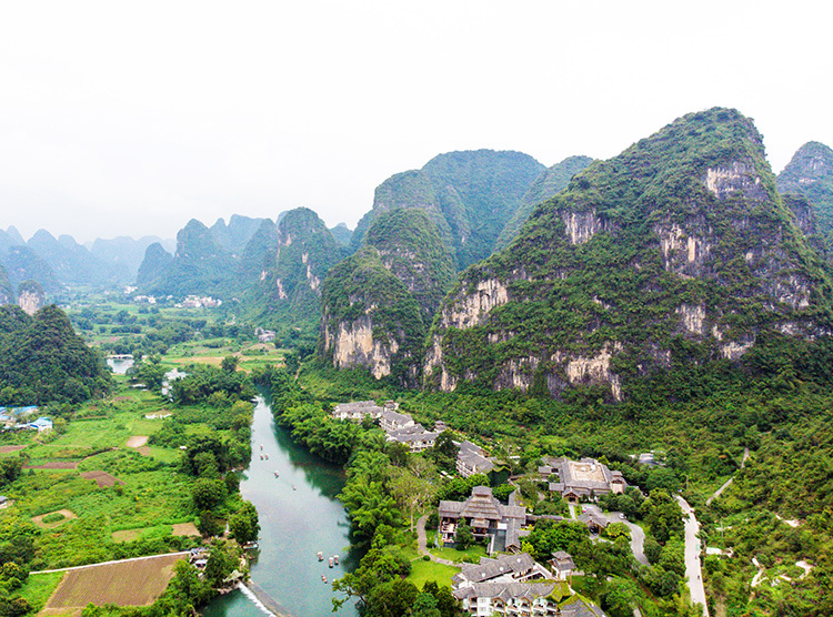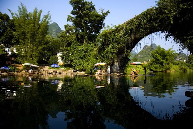 沿途阡陌纵横,古桥古城,仿佛世外桃源…,青山绿水无比惬意,整个遇龙河景区,没有任何现代化建筑,没有任何人工雕琢痕迹,没有任何一点都市喧嚣,一切都是那么原始、自然、古朴、纯净,实为桂林地区最大的纯自然山水园地,久居都市的人们,只要走近她,一股浓浓的欲罢不能的亲近感就会油然而生。