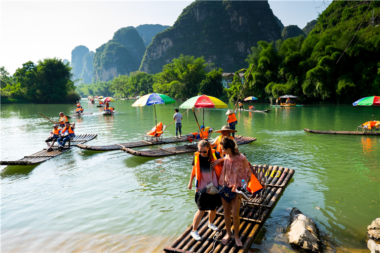 2、途经遇龙河码头时,还可以体验人工竹筏漂游,有双人竹筏和多人竹筏。