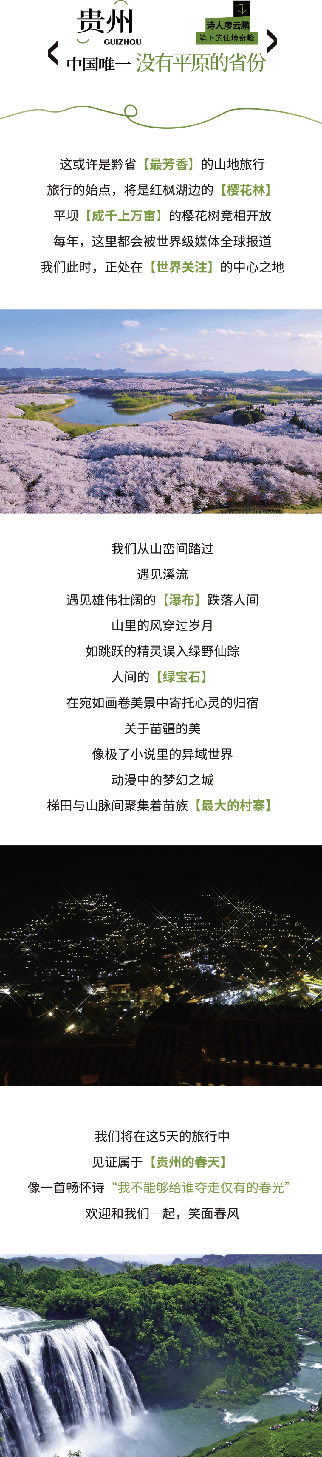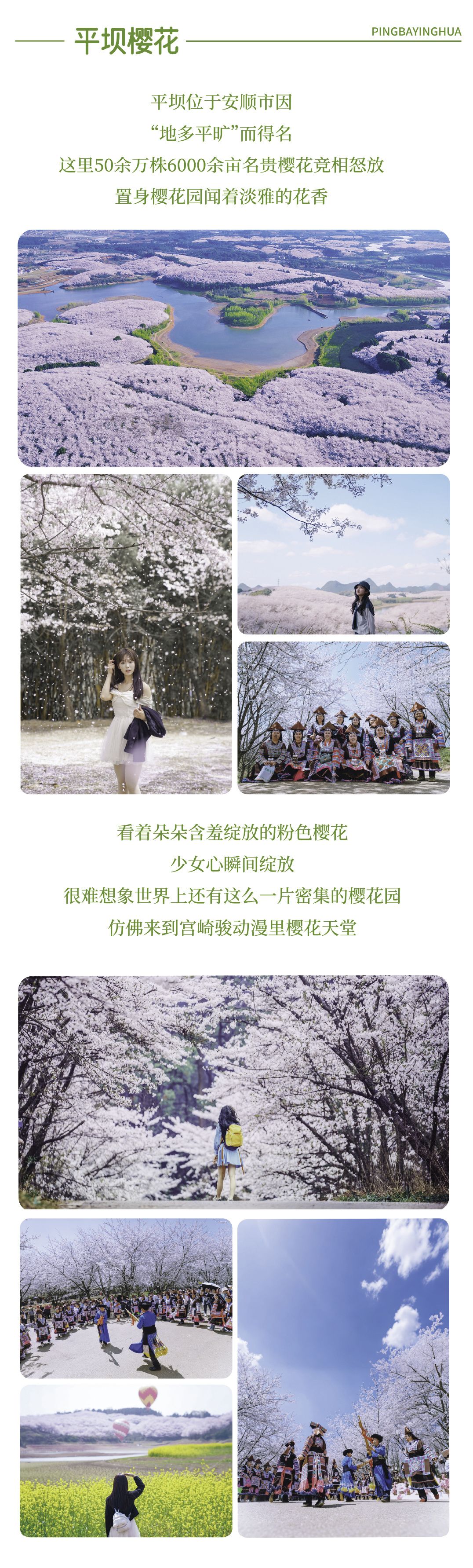 ① 按往年的花期经验,平坝樱花最旺花期均在3.18-3.28之间,但花期会受天气以及气温等因素影响而有变动,敬请大家谅解;如樱花未开或效果不好,刚会更换成青岩古镇以及独山天洞两个景点,增加的门票费用自行承担
