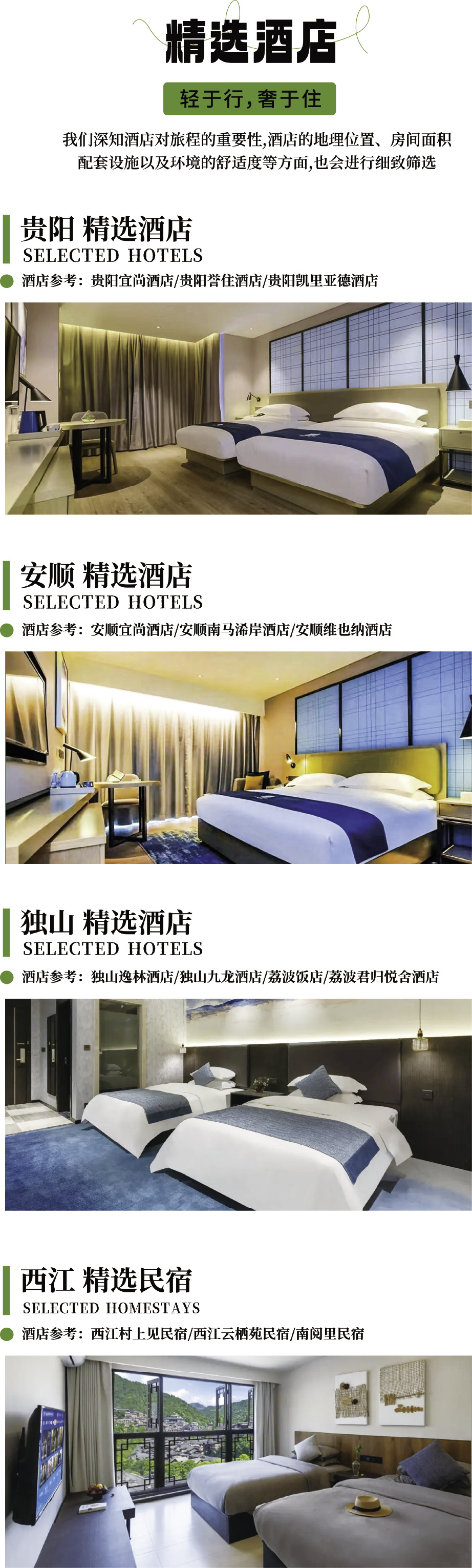 其他:费用包含所未提及的任何形式消费(如:黄果树景区扶梯索道、小七孔鸳鸯湖划船、西江苗寨商业演出等可自由选择消费项目)