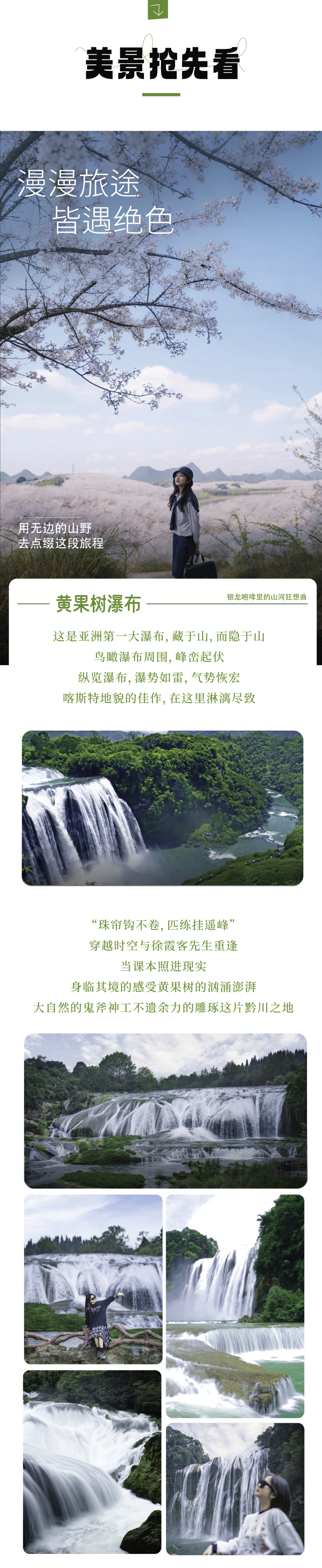 早餐后前往黄果树瀑布,这是中国大的瀑布之一,其壮观的景象定会让您惊叹不已。在这里,您可以感受到大自然的磅礴气势,也可以沿着瀑布旁的小径漫步,欣赏沿途的美景。