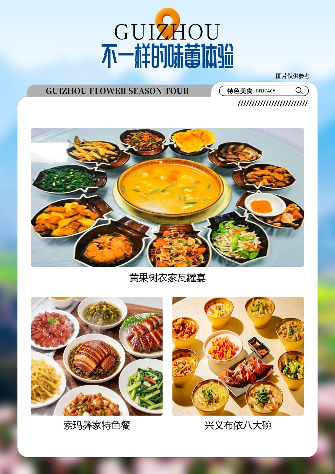 10. 贵州地处云贵高原地区,山路较多,请穿轻便、柔软休闲鞋子;贵州素有天无三日晴之说,天气多雨,请自备雨伞;少数民族寄居地,请遵循当地风俗。