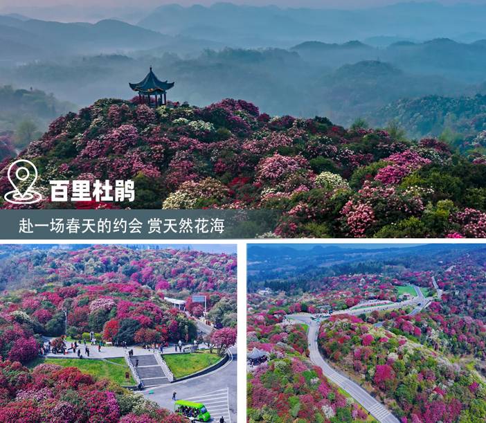 景区描述:百里杜鹃林带延绵50余公里,宽约1~3公里,有马缨杜鹃、大白花杜鹃、水红杜鹃、露珠杜鹃等41个品种,占世界杜鹃花5个亚属中的全部,最为难得的是“一树不同花”,即一棵树上开出若干不同品种的花朵,最壮观的可达7种之多,花色多样,绚烂生辉。每年3—5月花期时节,百里杜鹃竞相开放,红、白、黄、紫,如火如荼,若云若霞,百里花山色彩缤纷,犹如广袤的锦缎华章铺山盖岭,被誉为“世界上最大的天然花园”。